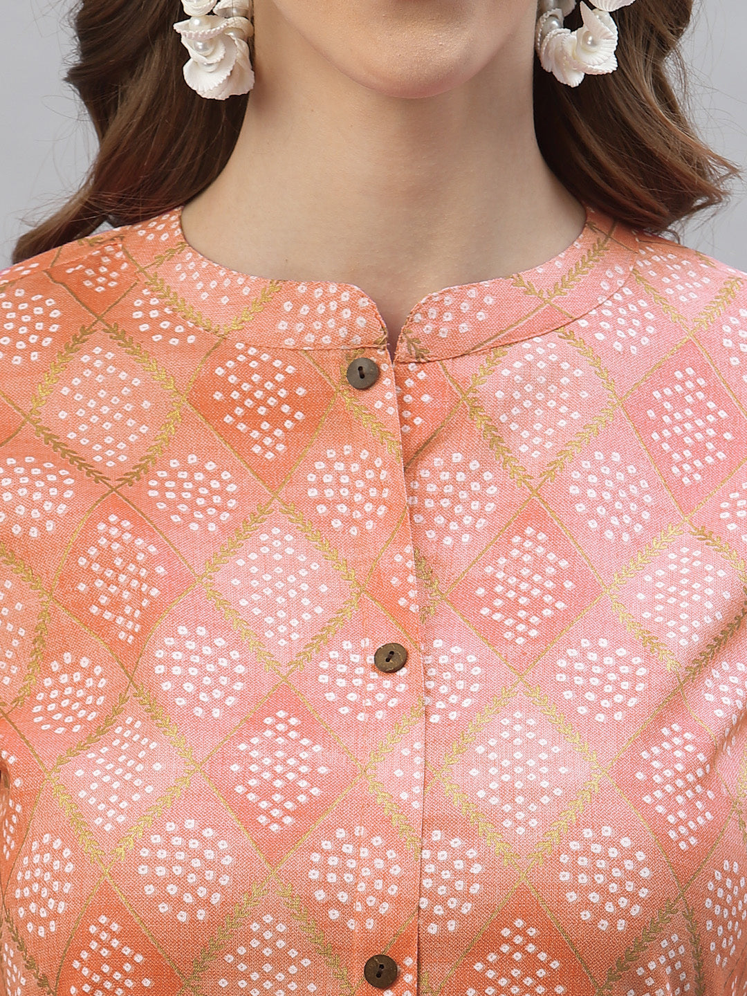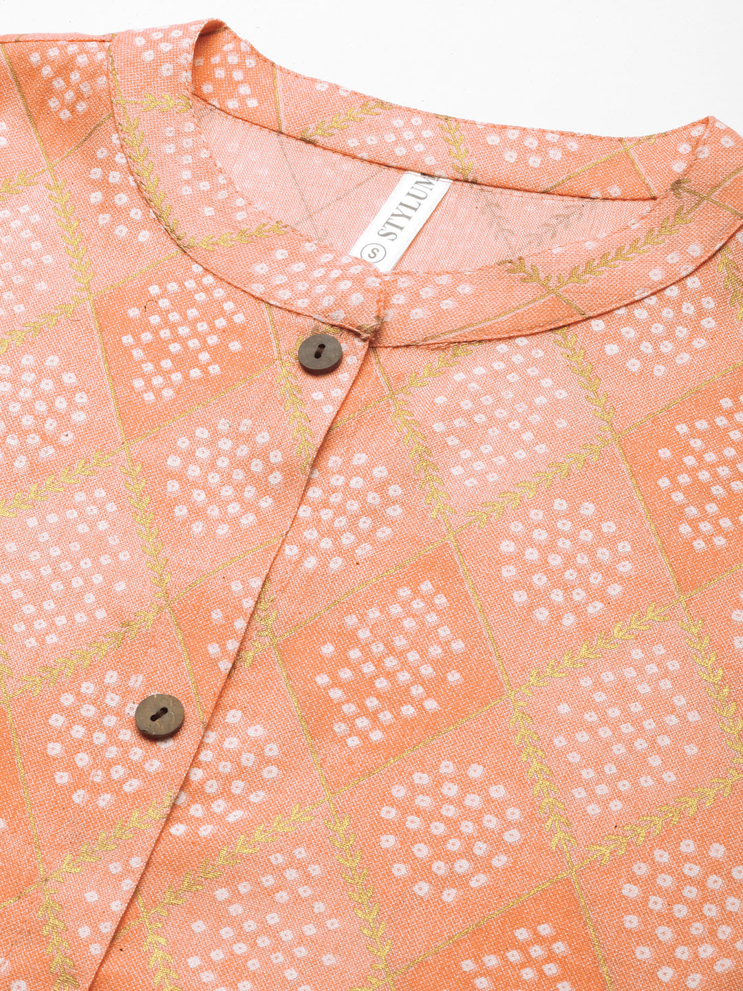 Enhance your look with this alluring Cotton Blend orange bandhani print A-Line cut kurta from Stylum. This beautiful kurta features a mandarin neckline, ¾ the sleeve, side slits and a detailed neckline with wooden buttons on the front placket. The kurta is crafted using premium quality cotton fabric, which speaks for its comfort. The unique combination of bandhani print and golden embellishments makes this kurta look visually stunning and ideal for special occasions. Pair this kurta with off-white palazzos or leggings to complete the look. Add golden earrings and sandals to enjoy a more appealing look.