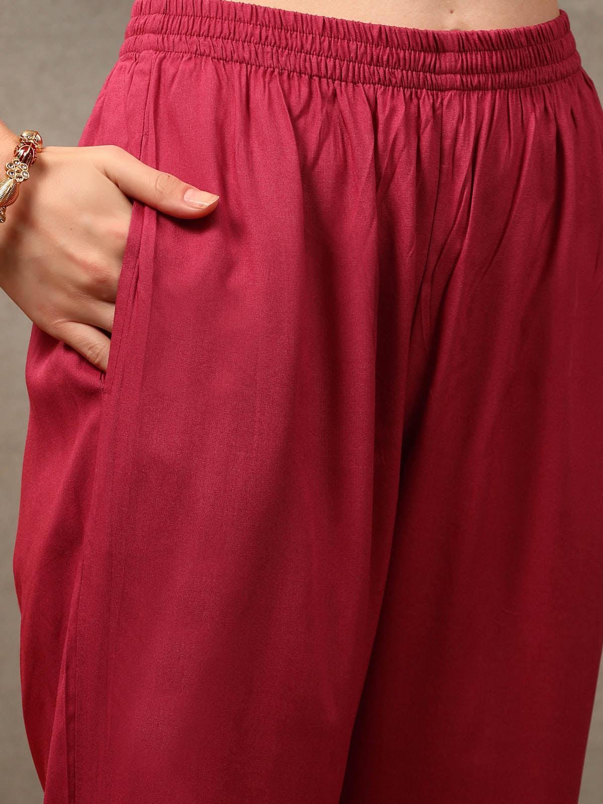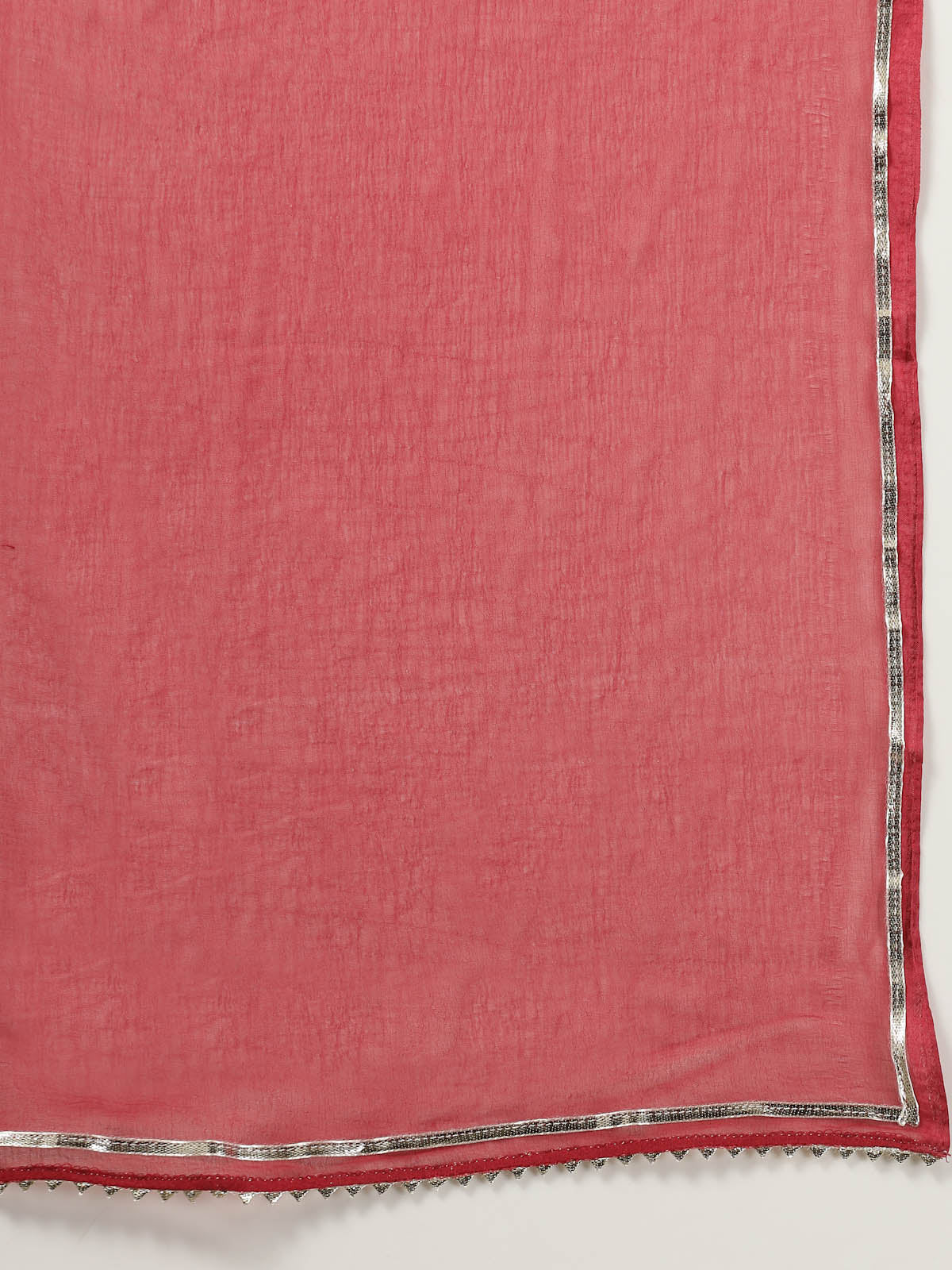 Rose pink coloured bandhej printed kurta set in rayon. Kurta has Zari Embroidery detailing on neckline.Printed pant has full elasticated waist. Solid chiffon dupatta with lace detailing. Kurt Length- 45" Inch, pant length - 38" inch, Dupatta length - 2.30mtr. Casual to occasion wear outfit.