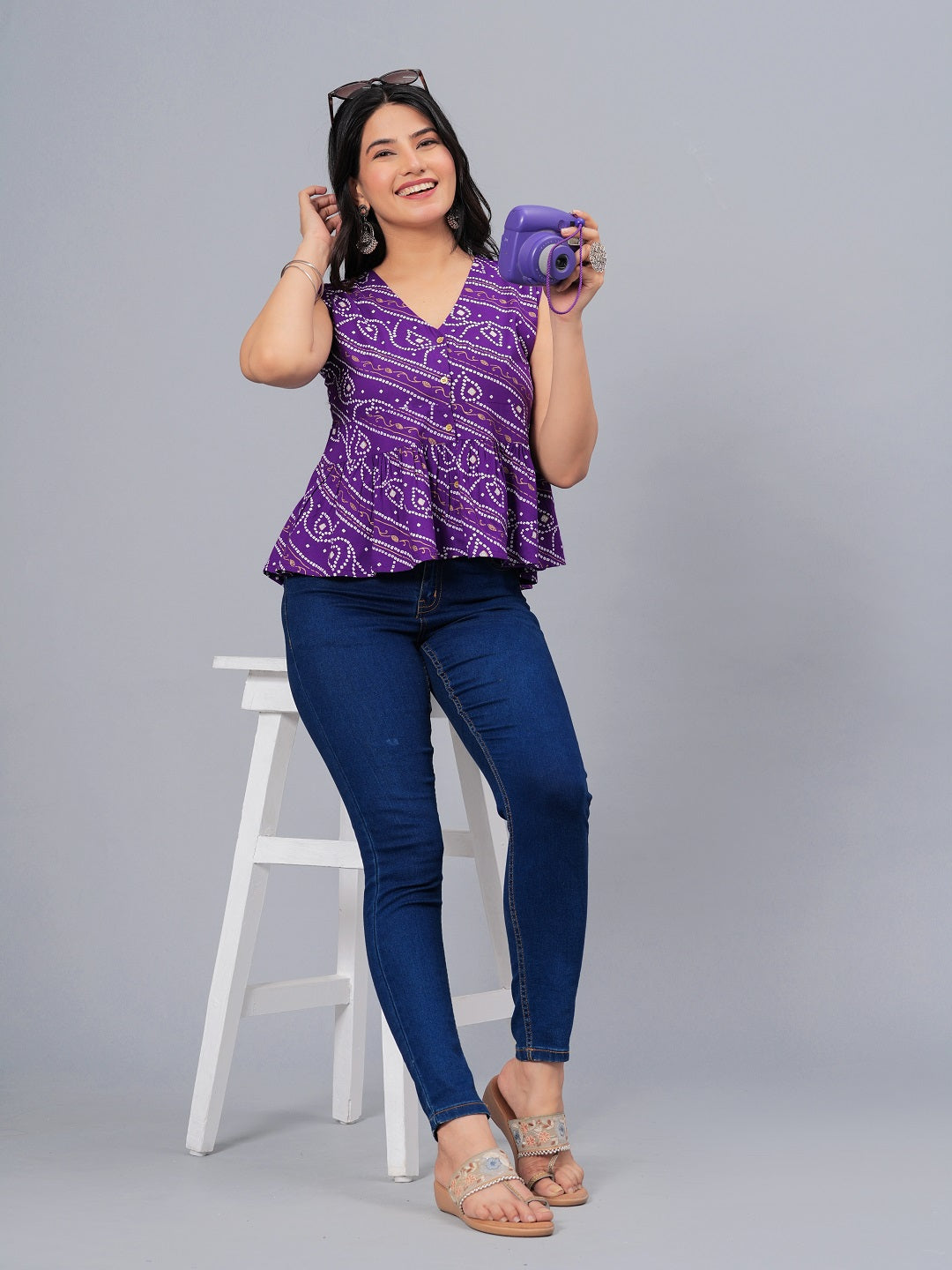Purple Bandhej printed V- neck peplum top. Front Functional Placket with shell button. Sleeve less top with belt detailing on waist. Top length - 20'', Casula wear top.