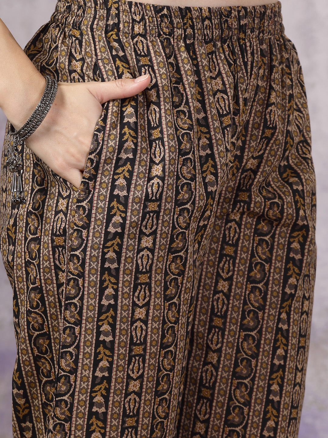 Black cotton Ajrakh printed Angrakha kurta pant dupatta set . Kurta has printed border in neckline with dori tassles. Printed bottom has fully elasticated belt. Paired with chiffon tie & dye dupatta, Kurta Length- 45" Inch, Pant Length - 38'' Inch, Dupatta Length - 2.30 mtr.