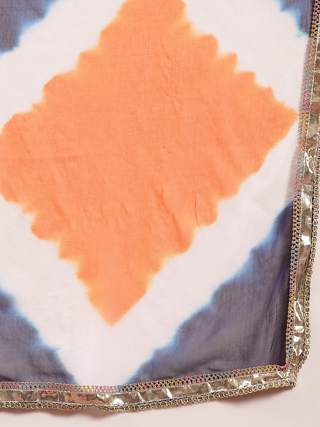 Blue bandhej crepe flared kurta pant dupatta set. Kurta has v-neck with embroidery on neckline & hemline detailing on it and regular sleeves with attach lace. Blue bandhej printed crepe pant has fully elasticated waistband. Paired with tie-dye chiffon dupatta. Kurta Length- 46'' Inch, Pant Length- 38'' Inch, Dupatta Length- 2.30 Mtr.