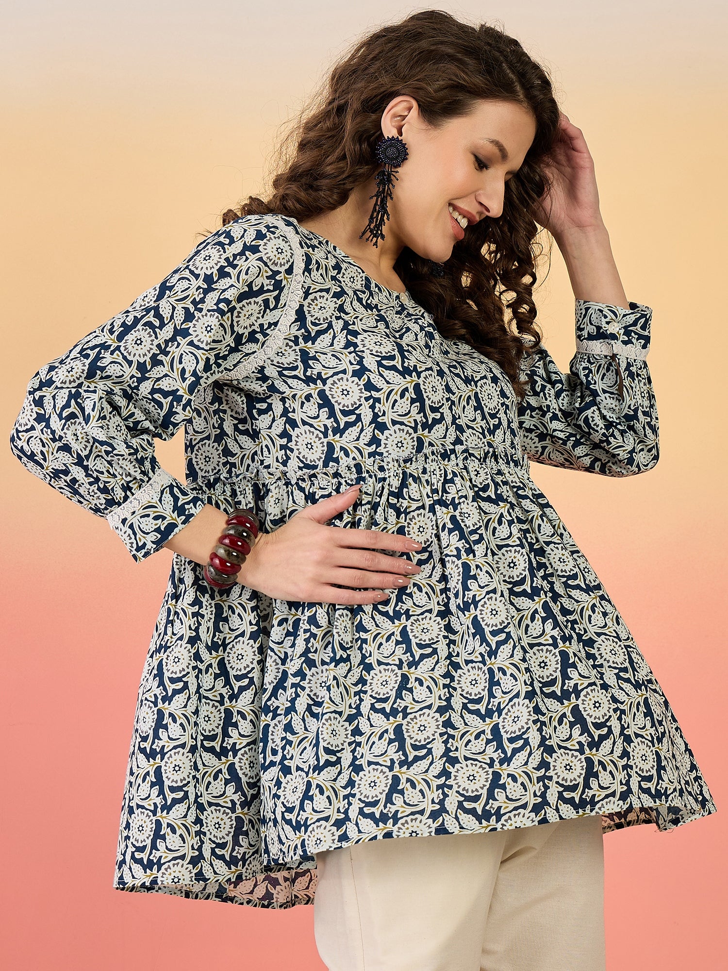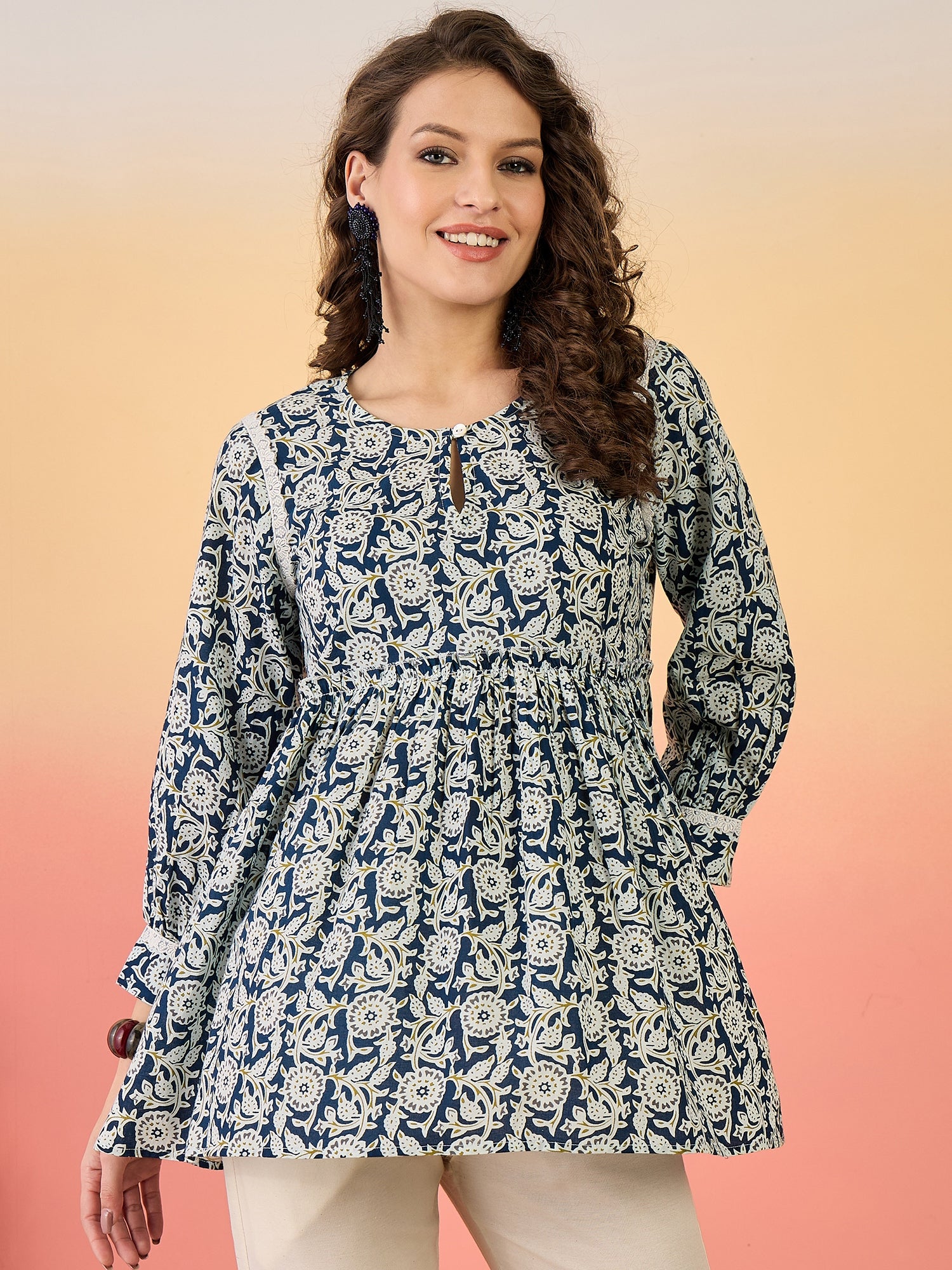 Blue printed round neck top with lace detailing on armhole and gathred sleeves with lace, Top Length- 28'' Inch.