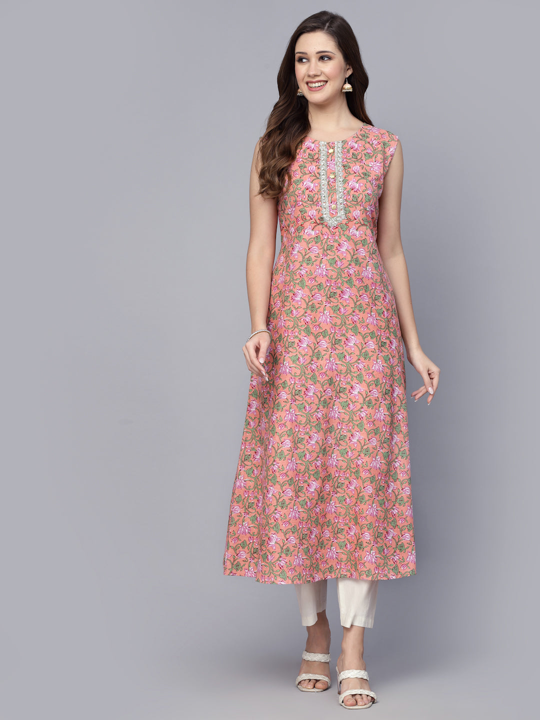 Experience the joy of wearing our Women's Floral Printed Cotton A-Line Kurta for women and embrace your inner grace and style. Crafted in a beautiful peachy coral shade, this flared kurta is designed to make you feel truly special. Made from high-quality cotton fabric, this kurta is not only stylish but also comfortable to wear throughout the day . The exquisite floral print adds a touch of femininity, while the A-line silhouette flatters your figure and ensures a comfortable fit. The kurta is embellished with fancy lace detailing and gold buttons on the front placket, adding a touch of glamour to your overall look. Shop now and step out in confidence!