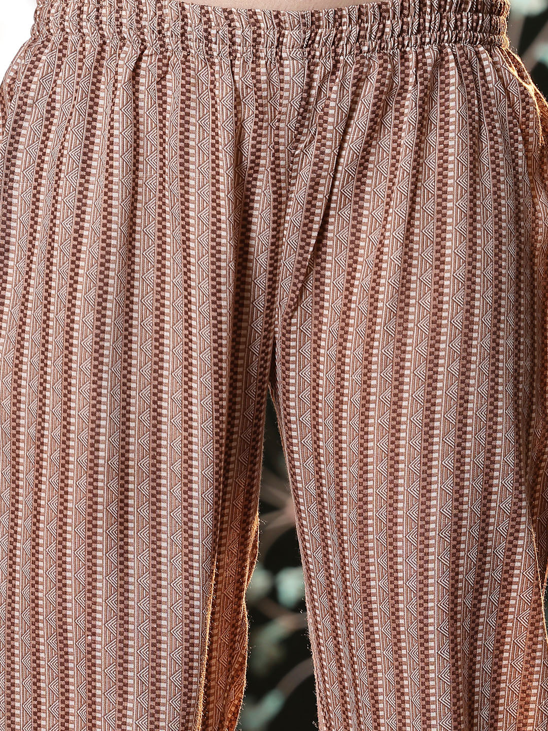 Brown floral printed kurta pant set in cotton blend fabric. It has shirt collar and 3/4 sleeves in A-line pattern. Top length -46'' and pant length -38".