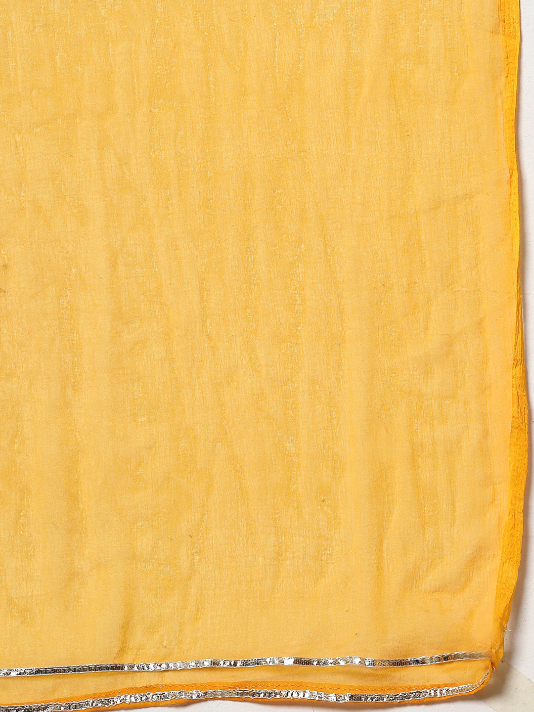 Floral printed cotton straight kurta with embroidered lace detailing on yoke & sleeves. Solid pant which has full elasticated waistband and solid chiffon dupatta. Pair it with beautiful accessories like jhumkas, kadas and jutties. Kurta Length- 46" Inch, pant length - 38" Inch, Dupatta Length- 2.35 Mtr.