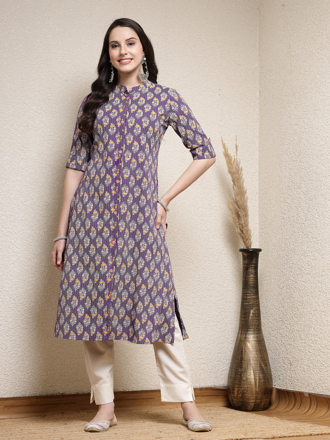 Voilet paisley printed rayon a-line kurta with mandarin collar, roll up sleeves and pignose button detailing on front placket. Kurta Length -45" Inch. Casual to office wear kurta.