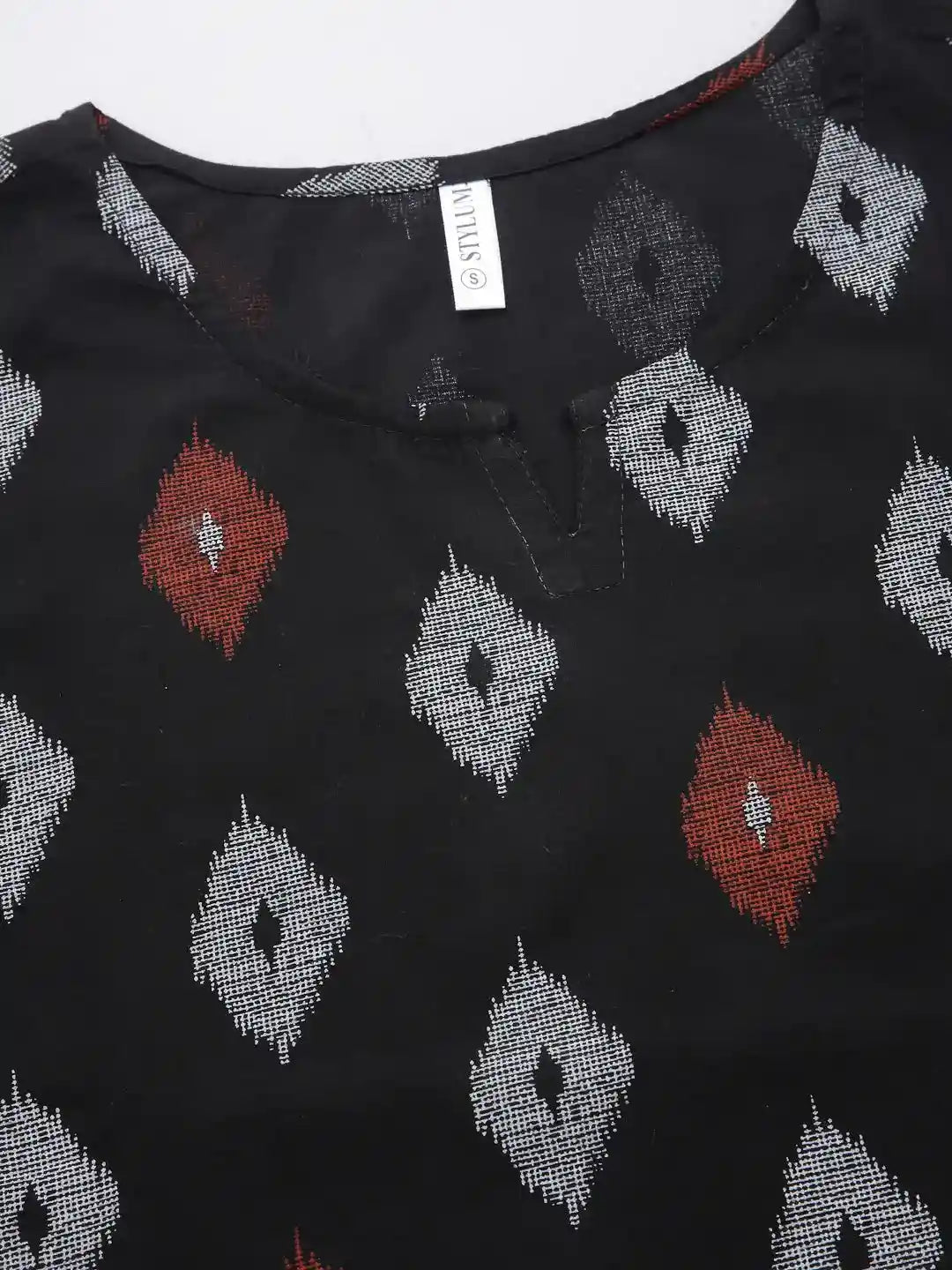 Upgrade your wardrobe with Stylum Women's Ikat Printed Cotton Gathered Ethnic Short Kurta. This black cambric kurta boasts a gorgeous flared design that exudes elegance and style. The mandarin neckline and 3/4th sleeves with white button detailing on the front placket add a touch of sophistication to the garment. Measuring 28 inches in length, this kurta can be paired with denims or a contrast bottom to create a fashionable ensemble. The ikat print adds a traditional touch to the kurta, making it perfect for any ethnic occasion. Buy ethnic kurtas online with Stylum.
