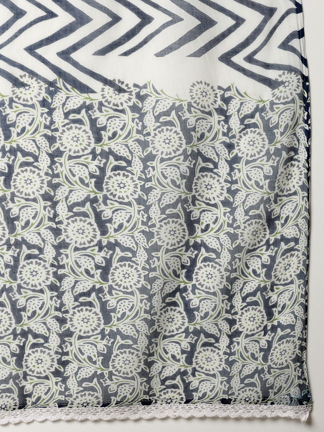 Blue floral print a-line flared cut short kurti with pant dupatta set. Kurta has beautiful laces in yoke and sleeves. Solid rayon bottom has lace detailing and fully elasticated belt. Cotton floral printed dupatta. Kurta Length- 36" Inch, Pant Length - 38'' Inch, Dupatta Length - 2.30 mtr