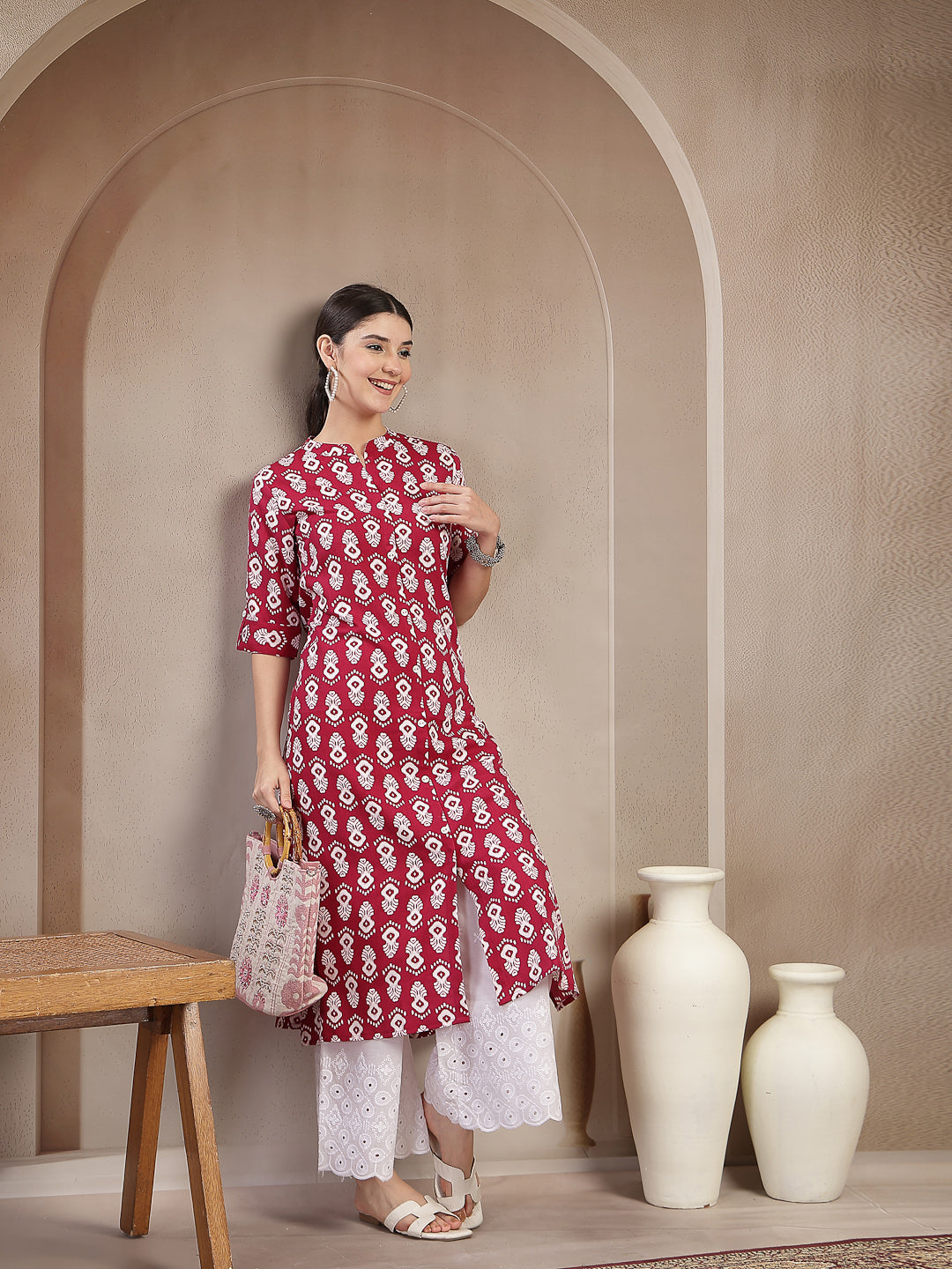 Maroon ikkat printed cotton straight kurta. Kurta has mandarin collar with front placket and buttons detail on it and roll-up 3/4th sleeves. Kurta Length -45'' Inch.