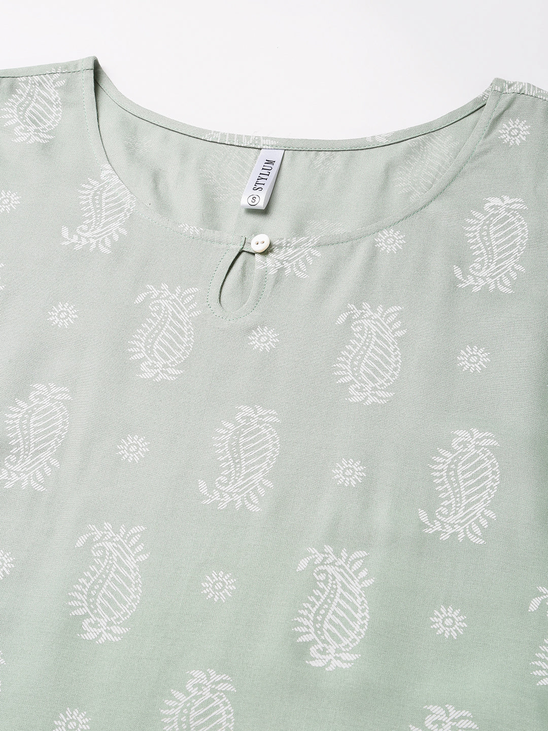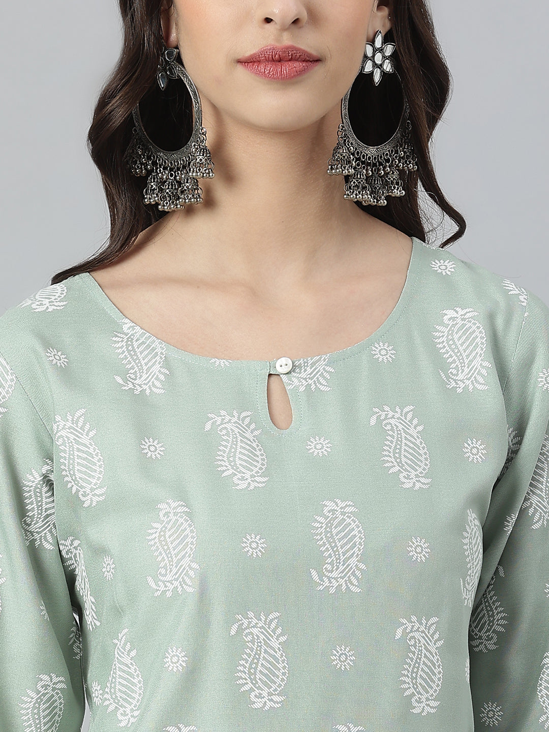Rayon mint paisley khari printed straight kurta with round neckline, 3/4th sleeve and side slit detail. Pair it with schiffli off white pant or palazzo to complete the look. Product kurta length - 45" inch.