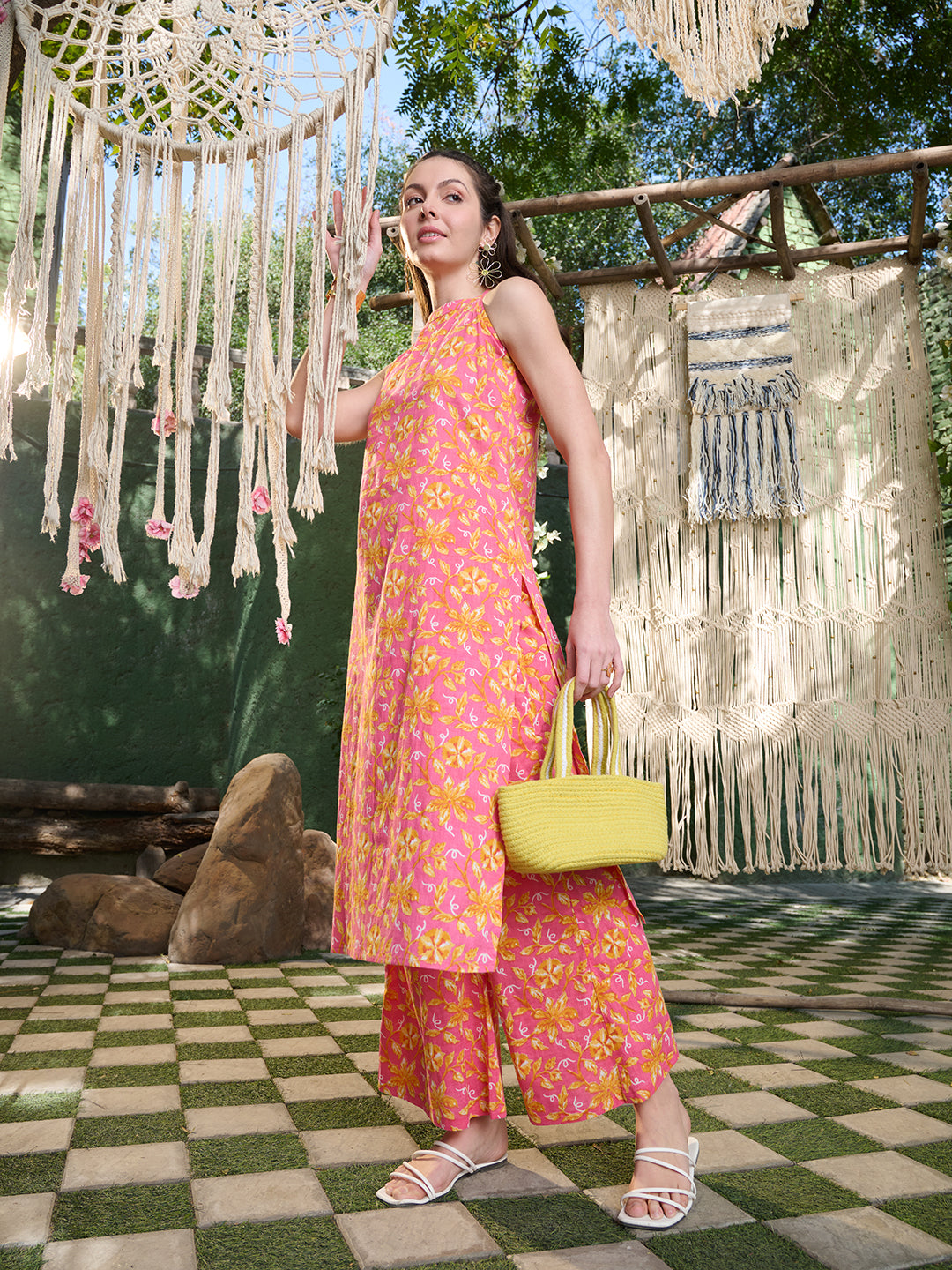Pink cotton floral printed kurta pant set. Kurta has Collared Halter neckline and sleeveless. Cotton floral printed palazzo fully elasticated waistbelt. Kurta Length- 45'' Inch, Pant- 38'' Inch.