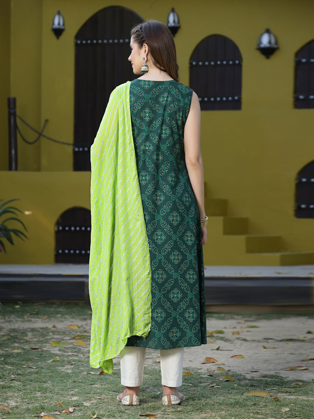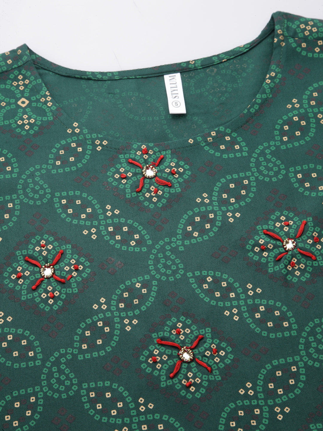 To keep Yourself trending among all, Stylum is a one stop Ethnic brand. Here Stylum brings you a beautiful dark green bandhani kurta with contrast lime dupatta. It is embellished with red kantha work. Being a flared kurta it is made of rayon fabric. It is perfect ethnic set to be wear on a casual outing to an occasional day. Style it with beautiful pair of coloful bangles and jhumkas. Cape Sleeves are included. Products Kurta Length-48" Inch, Dupatta Length- 2.20 Mtr