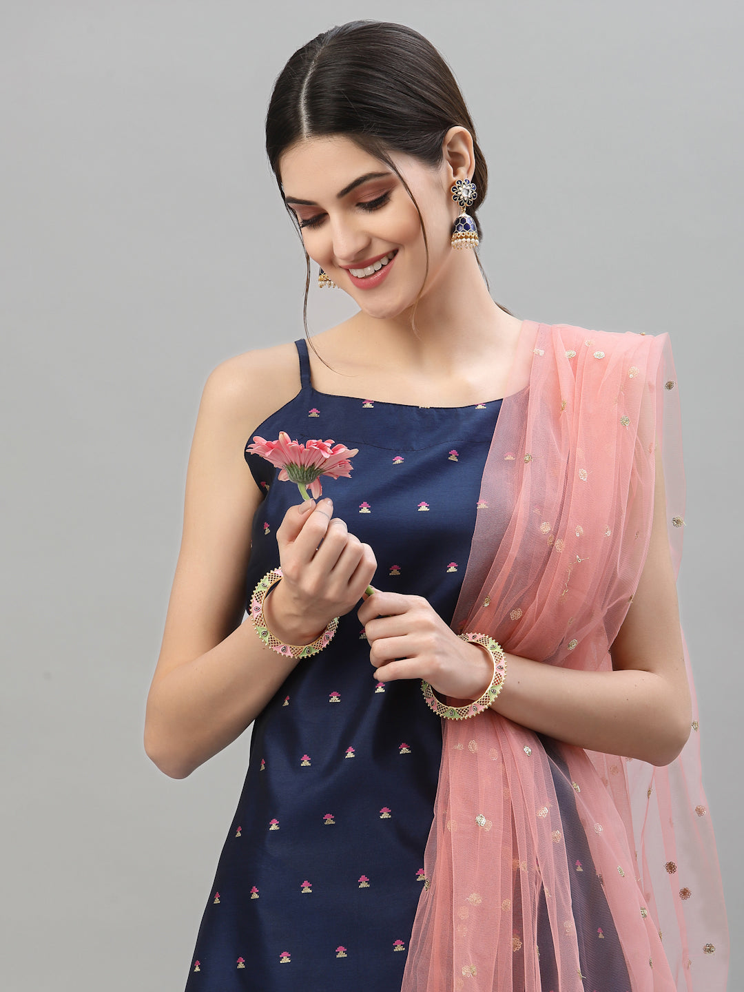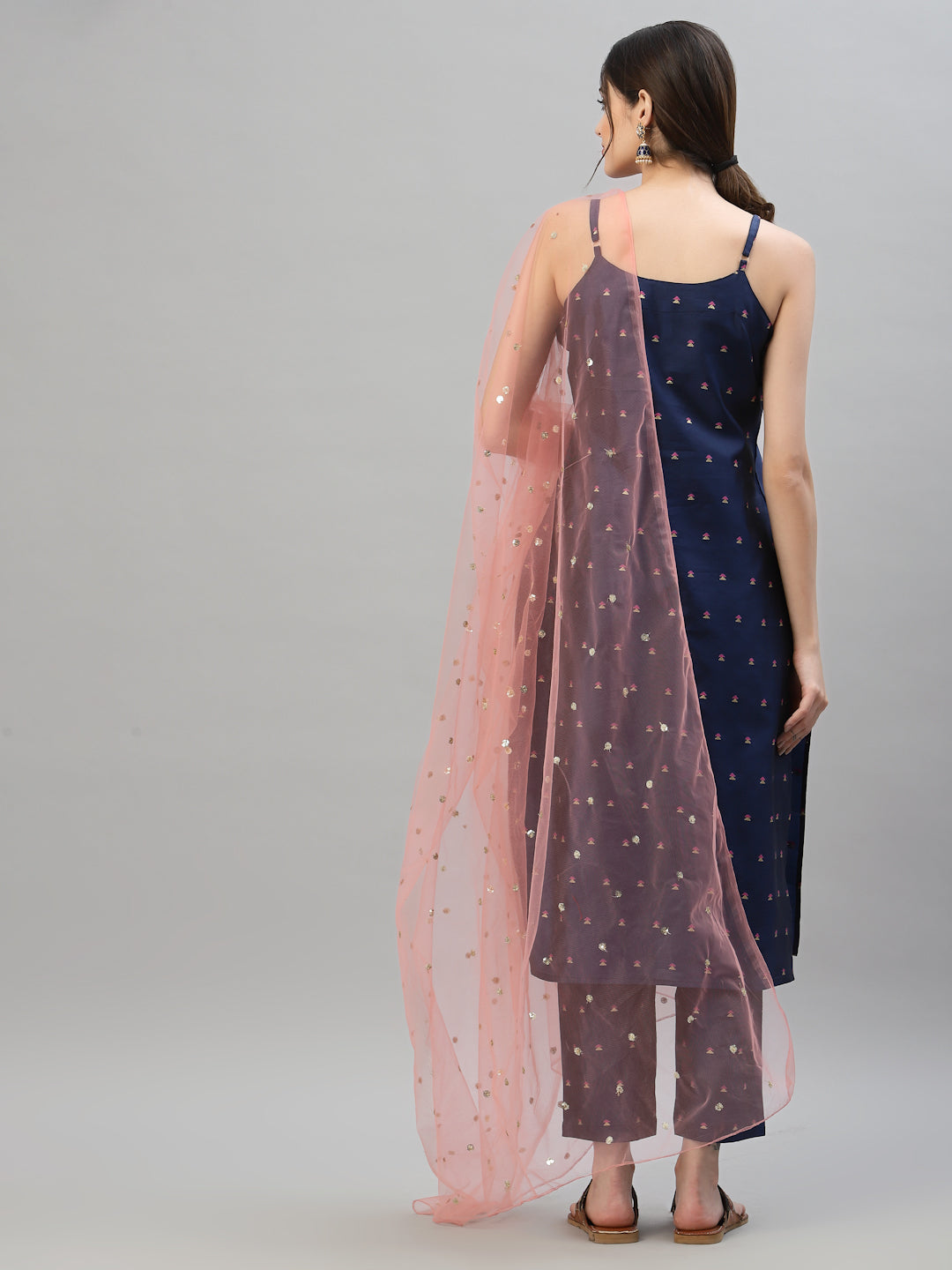 Add a unique charm to your wardrobe with this Self-designed Poly Silk Kurta Pant Dupatta Set from Stylum. Crafted from a luxurious silk blend fabric, this navy set features a self-woven motif designed straight calf-length kurta with strap shoulder sleeves, adding a touch of elegance to your outfit. The pant has a full elasticated waistband, ensuring a comfortable and flattering fit. The light pink sequence embroidered dupatta adds a pop of colour and sparkle to complete the look. Perfect for weddings, parties or any special event, the Self-designed Poly Silk Kurta Dupatta Set from Stylum is a must-have addition to your wardrobe.