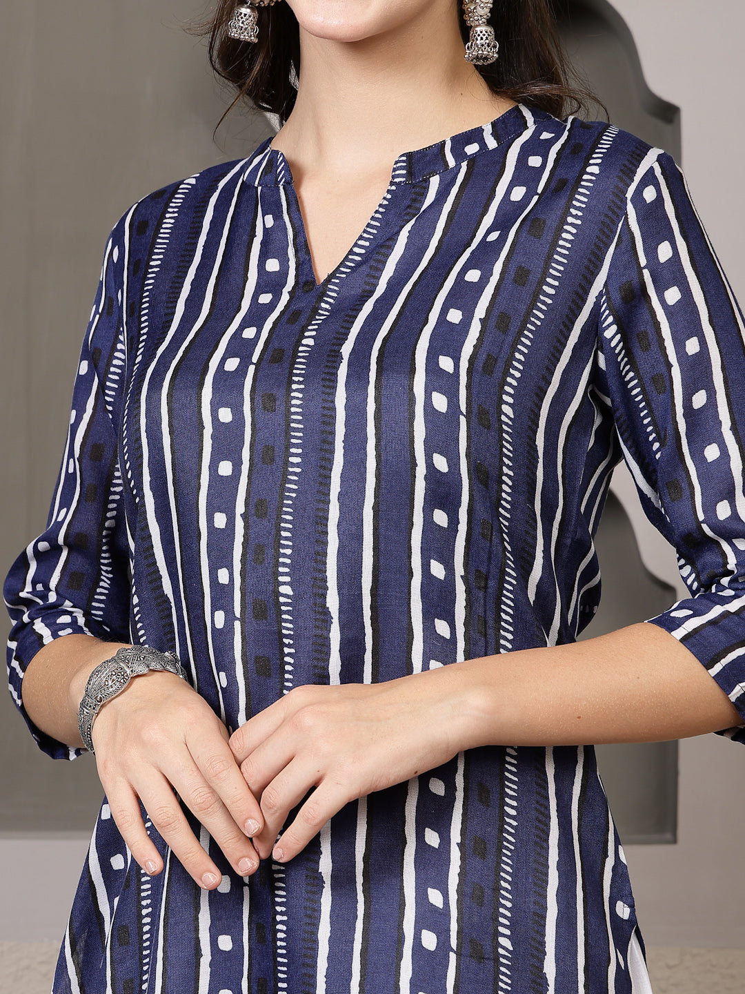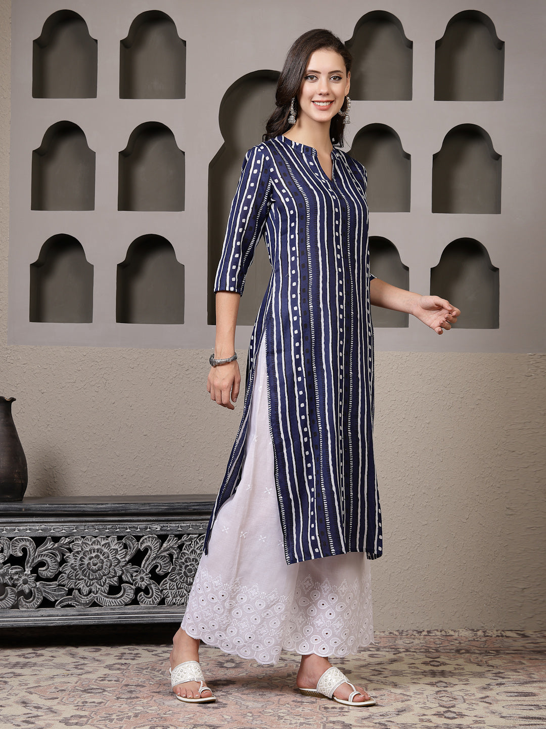 Blue colour printed cotton straight kurta with mandarin collar. It has stripe print and 3/4 sleeves. Kurta Length -45" Inch. Casual to office wear kurta.
