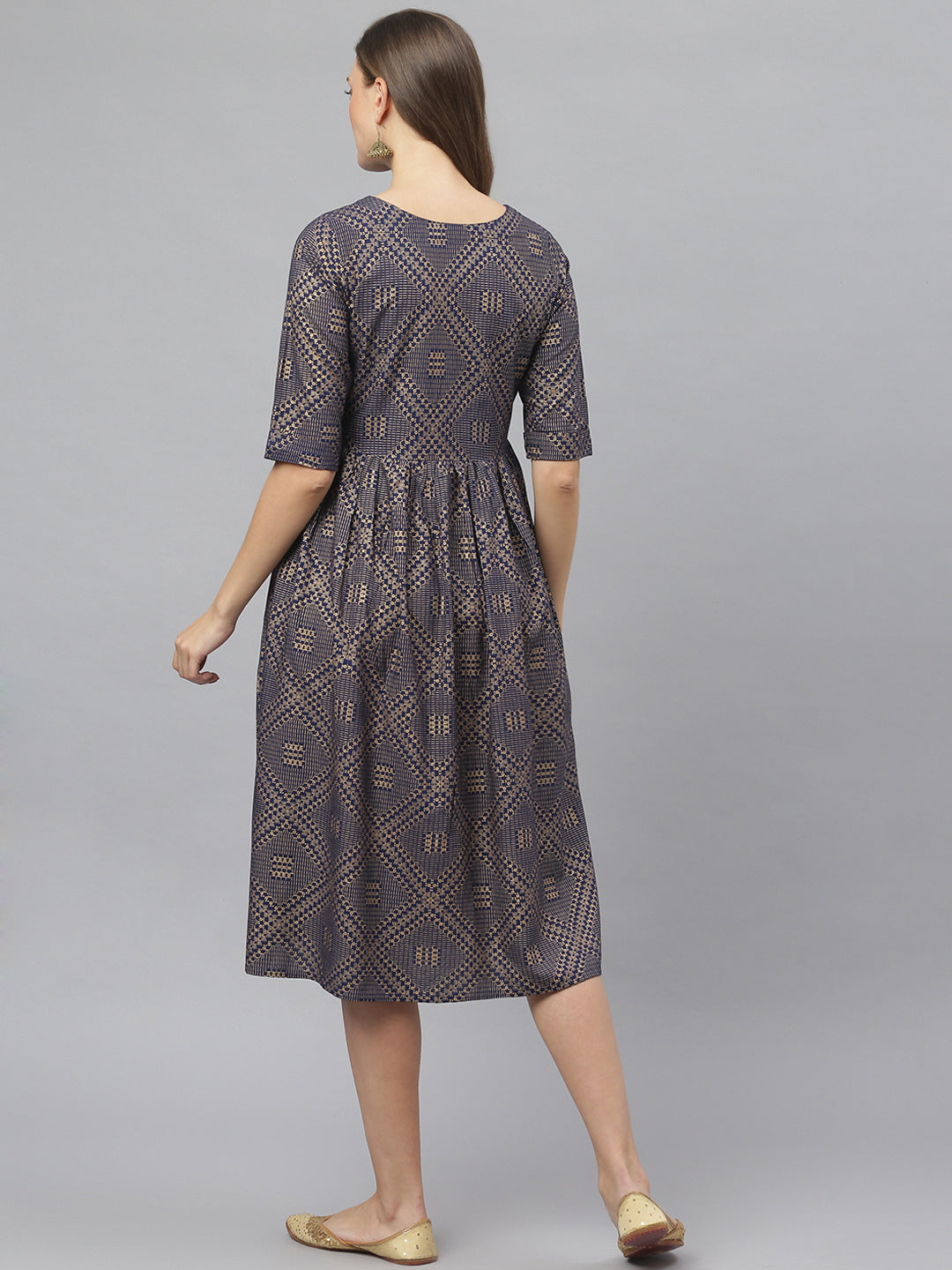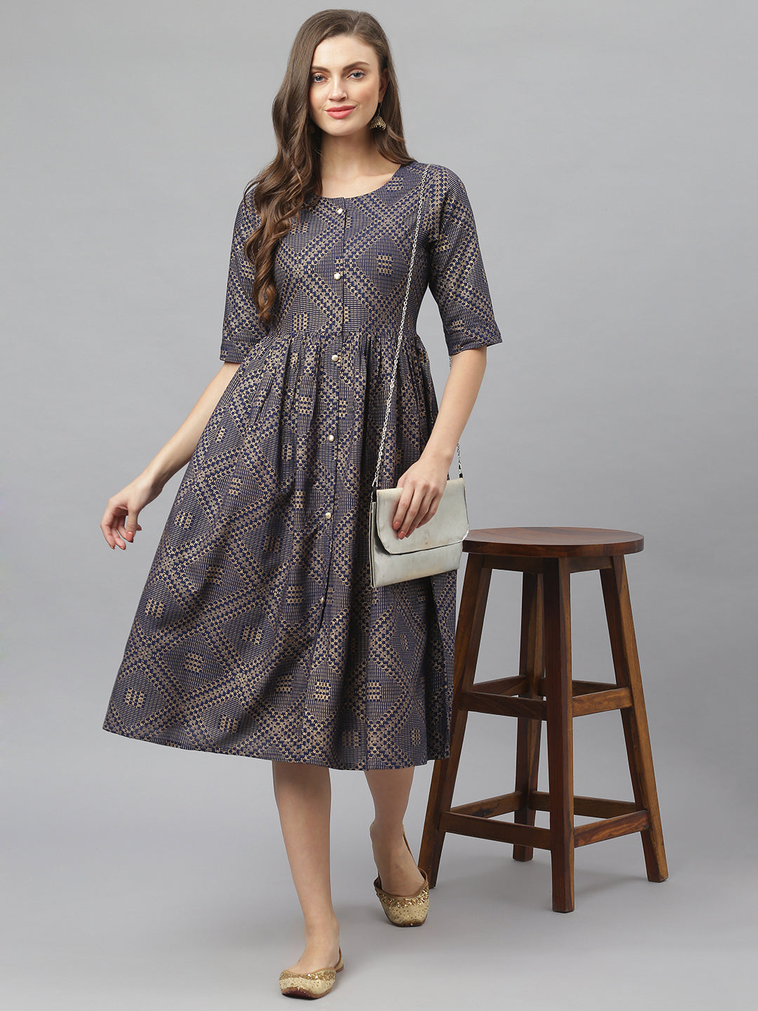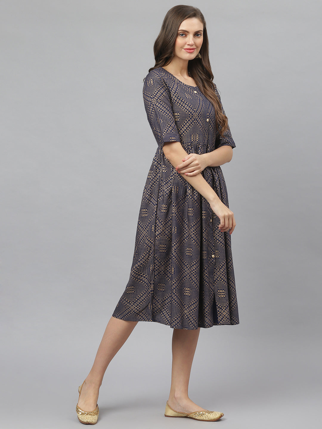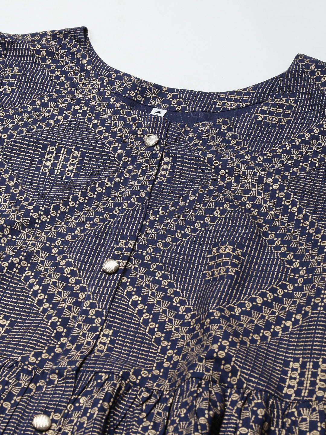 Navy rayon gold printed gathered dress with placket and wooden karigiri button detail, has a round neck, short sleeves, and flared hem. Pair it with beautiful heels and jhumkas. Product length- 46".