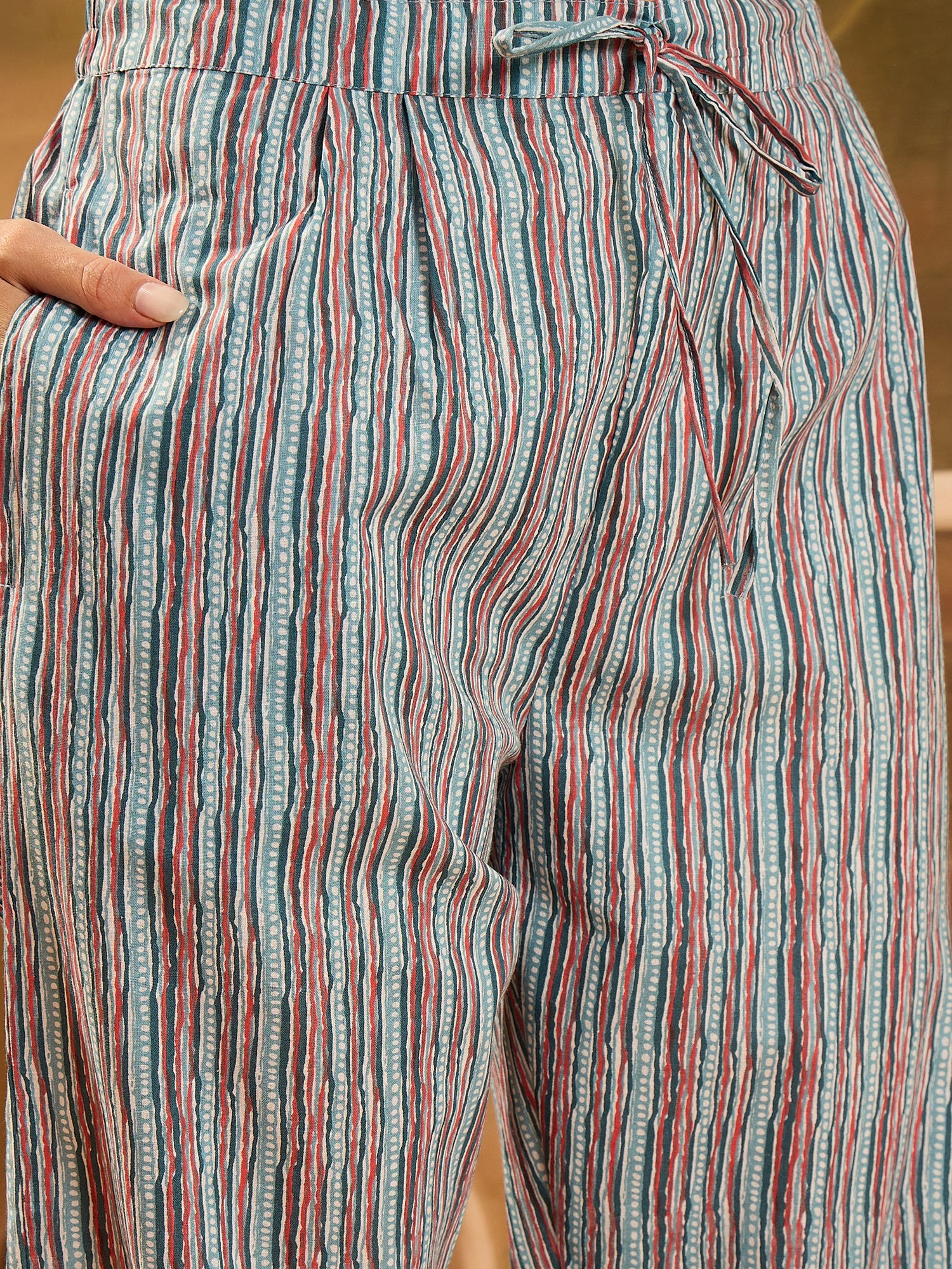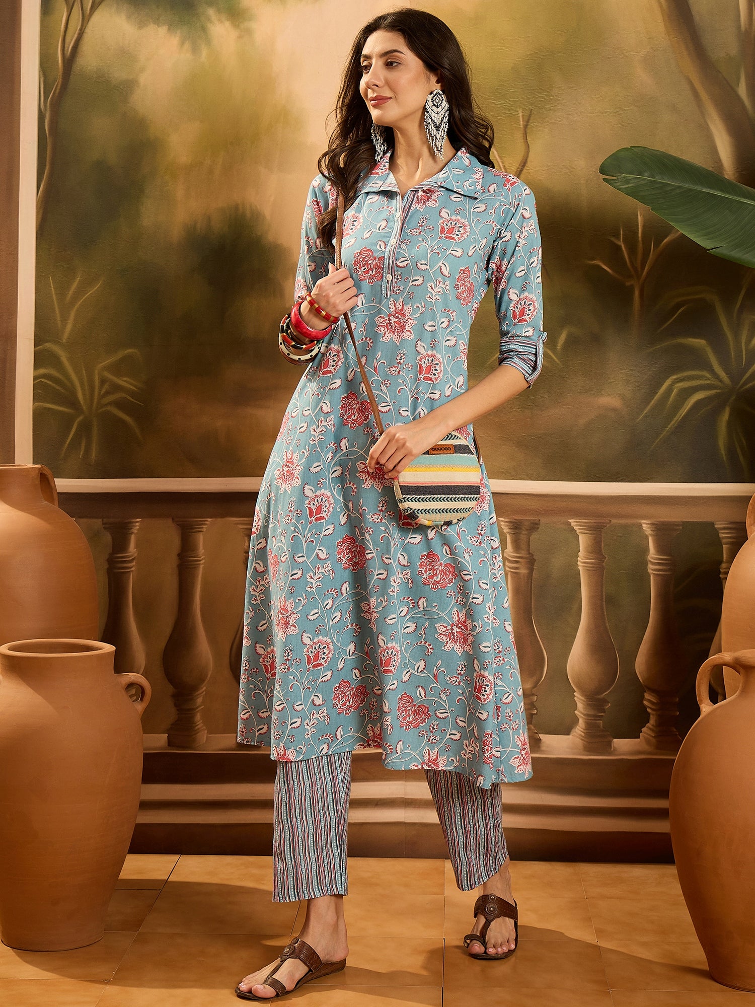 Turquoise blue cotton floral printed co-ords set. Kurta has coat collar and front button placket with cuff sleeve's and one side pocket in kurta. Paired with cotton striped printed pant with fully elasticated waist belt. Kurta Lenght- 45" Inch, Pant Lenght- 38" Inch.