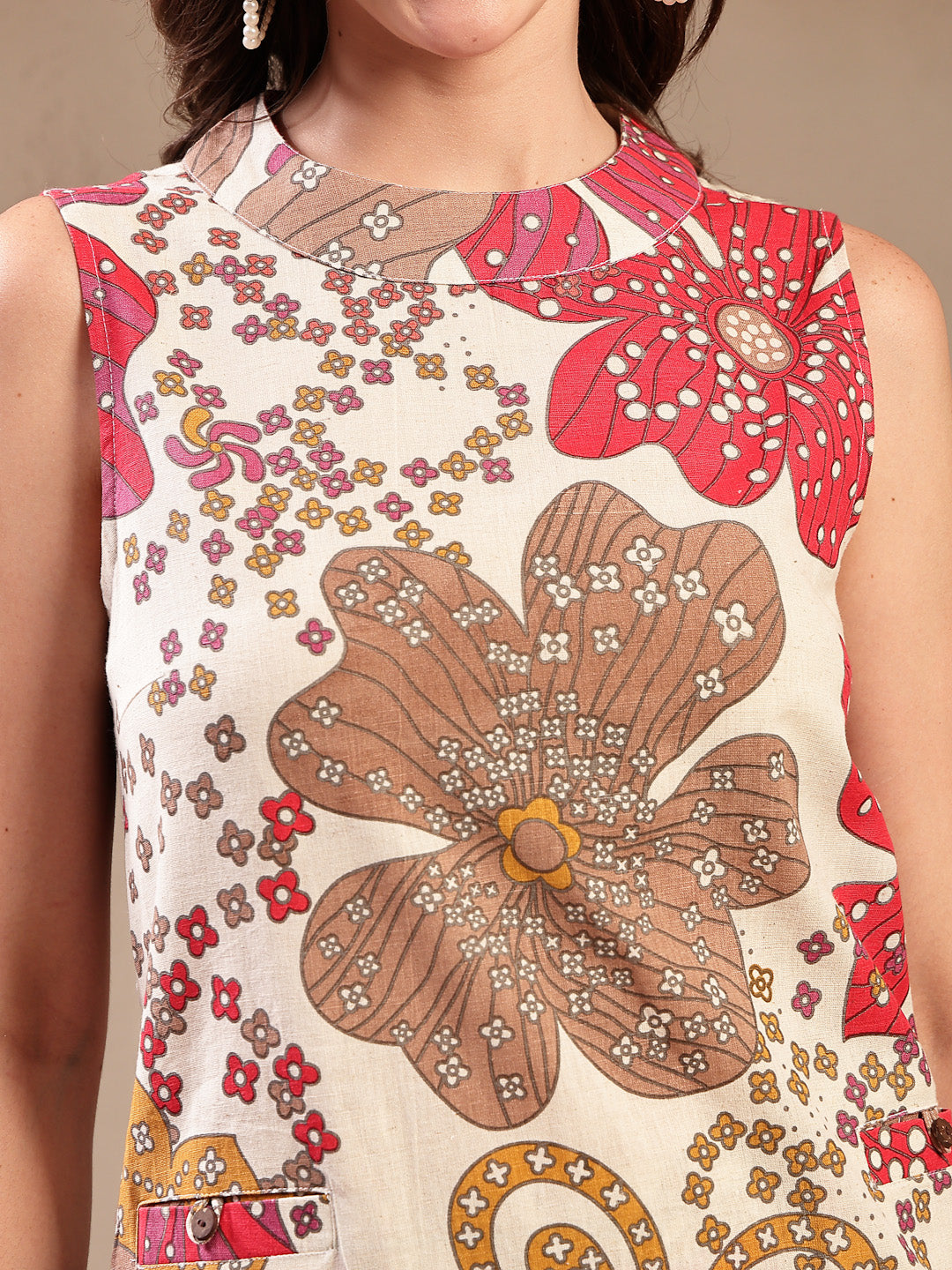 White cotton flax straight floral printed kurta pant set. Kurta has mandrian collar with front two pockets and sleeveless. White floral printed cotton flax pant has half elasticated waistband. Kurta Length- 45'' Inch, Pant Length- 38'' Inch.