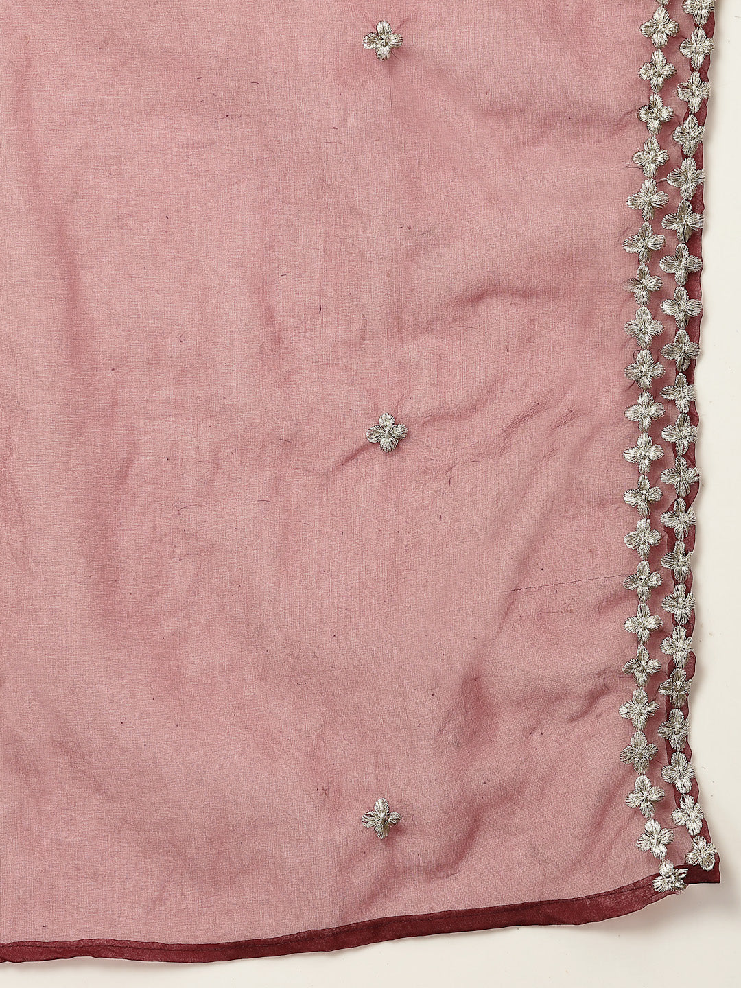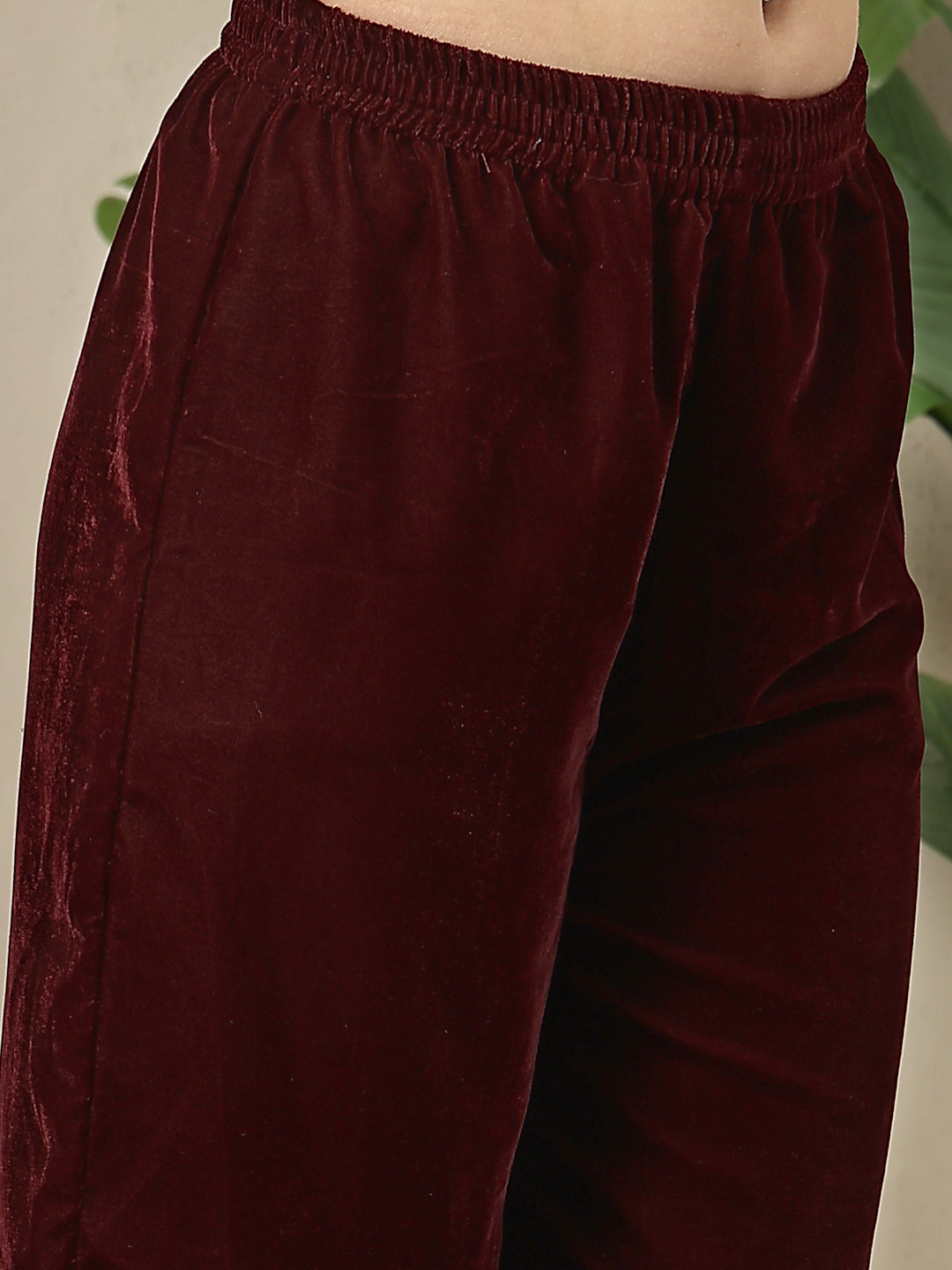 Wine solid velvet anarkali kurta pant dupatta set. Kurta has embroidered on neck and sleeveless. Deep back with dori and tassles. Fully elasticated solid pant and paired with organza solid dupatta with lace on it. Kurta Length- 48'' Inch, Pant Length- 38'' Inch, Dupatta Length- 2.30 Mtr. Pair it with stunning jewellery and heels to flaunt yourself.