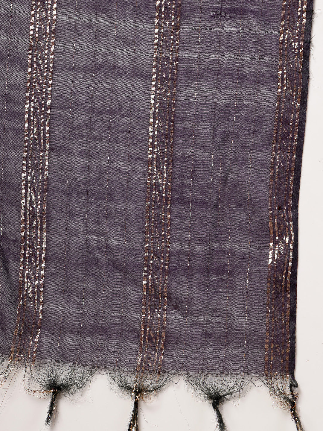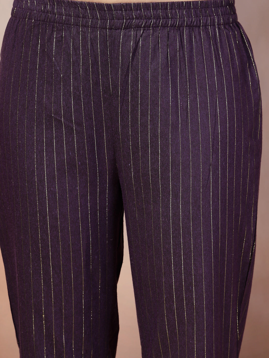 Violet kurta pant set in soft cotton blend lurex fabric. Kurta has V-neckline with Mirror embroidery, lurex pant has full elasticated waistband and Tie & dye lurex viscose dupatta. Kurta Length- 45" Inch, Pant Length - 38'' Inch and Dupatta length - 2.30 Mtr.
