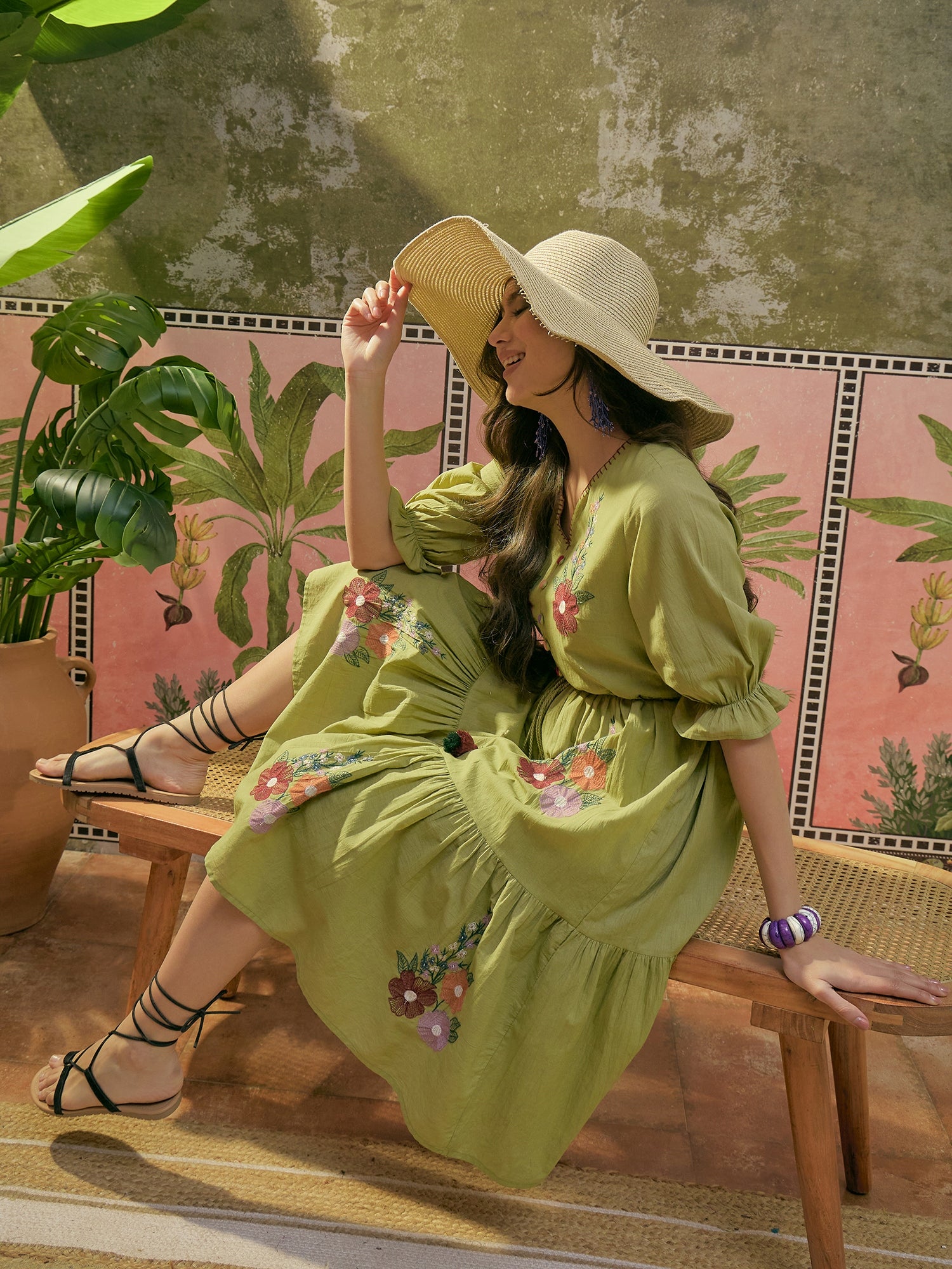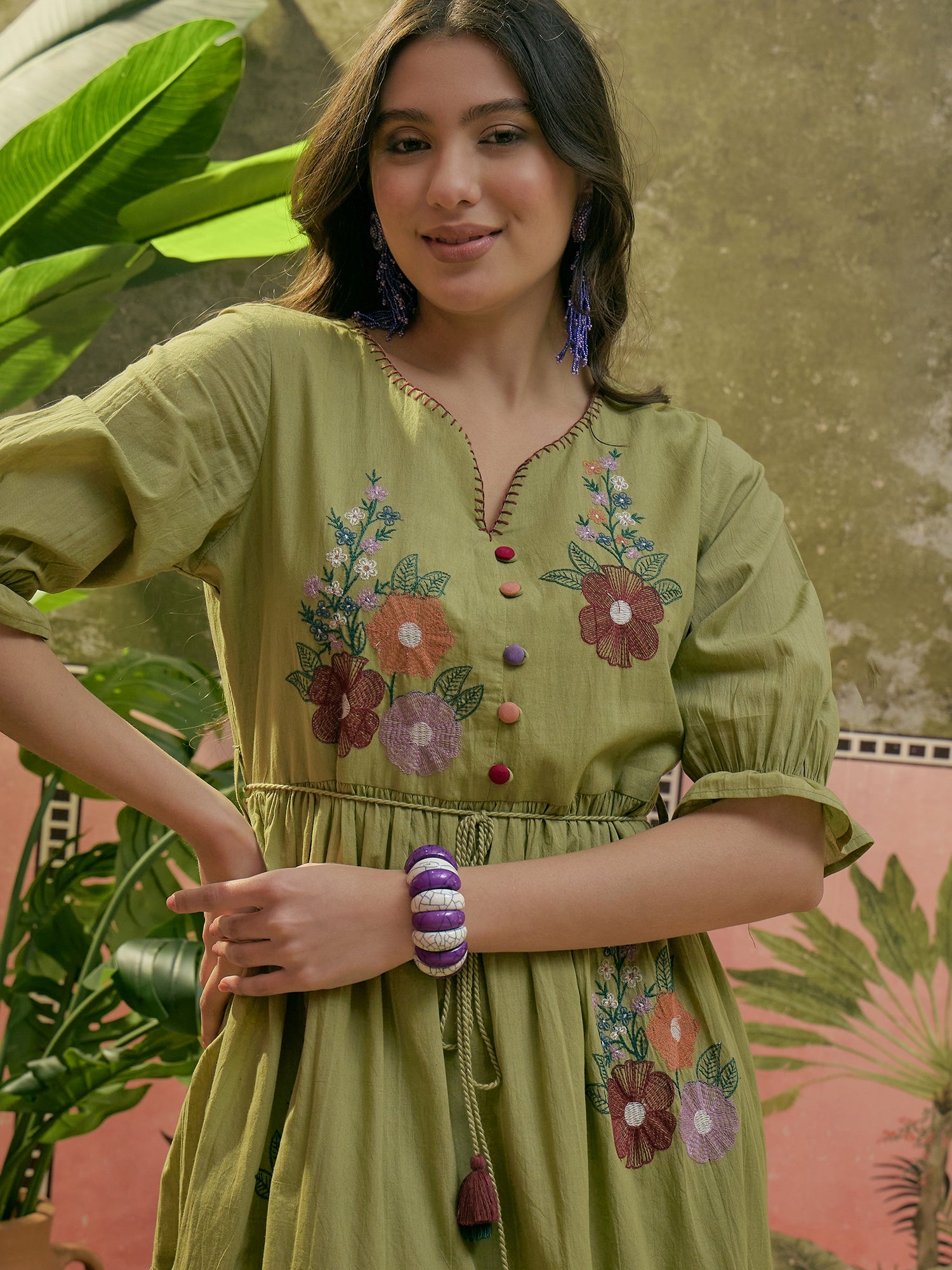 Green solid and embroidered cotton tiered dress. Dress has v-neckline with embroidery and front loop fabric buttons/dori-tassels detailing, it has inside mulmul lining and gathers and ruffeld sleeves. Dress Length- 42'' Inch.