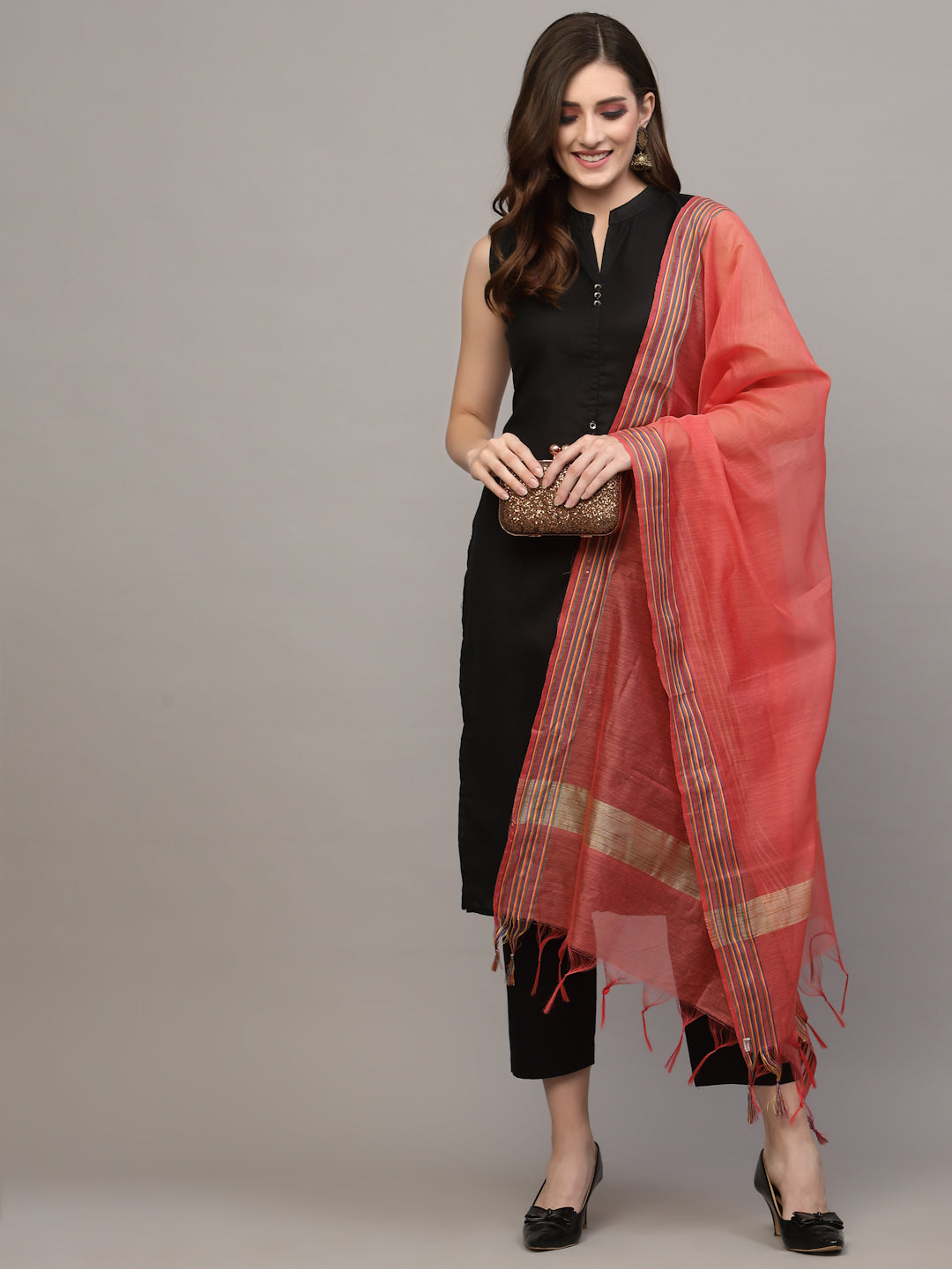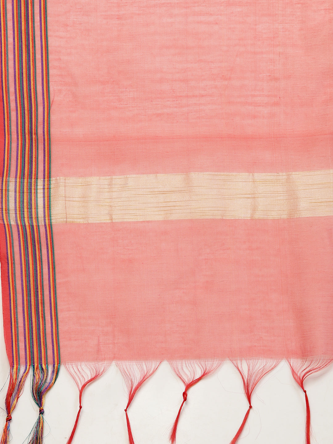 Jazz up your ethnic ensemble with this appealing and versatile chanderi coral self design dupatta detailed with fringes. Team it with a kurta or a tunic for a sublime look. Dupata Length- 2.25 Mtr