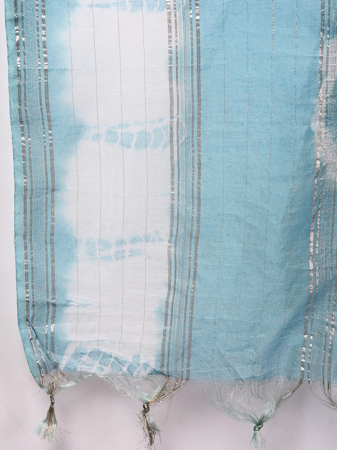Festive aqua blue cotton solid sleeveless tiered kurta pant dupatta set. Kurta has embroidered yoke. Gota detailing on tiered and bottom of kurta. Pant has fully elasticated waist belt. Paired with tie & dye lurex dupatta. Kurta Length - 52'' Inch, Pant Length - 38'' Inch, Dupatta - 2.25 Mtr.