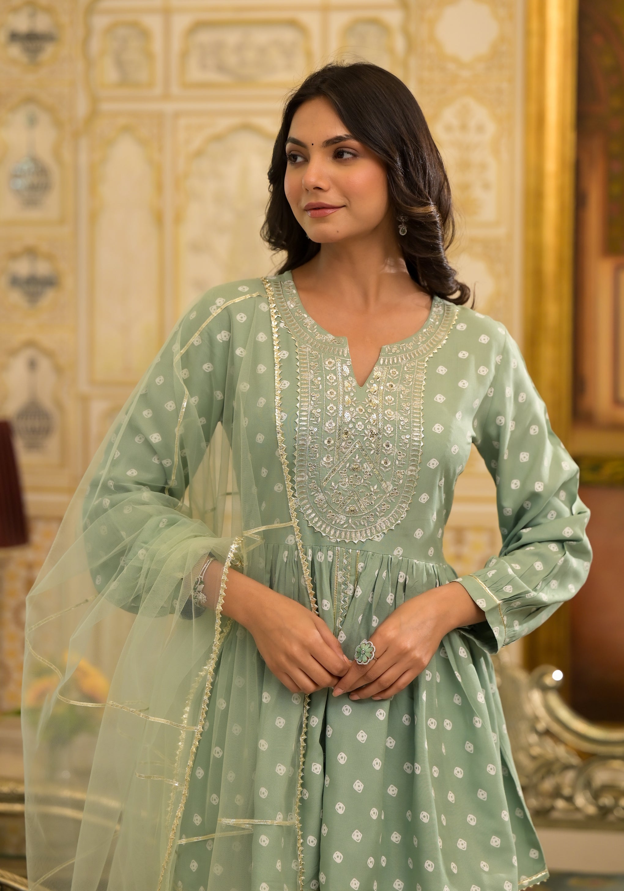 Green bandhej printed kurta dhoti pant and dupatta set in Rayon fabric. Beautiful zari & mirror embroidery on neckline. Lace attached on front slit and sleeves. Printed dhoti has full elasticated waist. Solid net dupatta with lace attached. Kurta Length- 34" Dhoti length - 39''. Dupatta length - 2.30 mtr. Festive wear outfit.