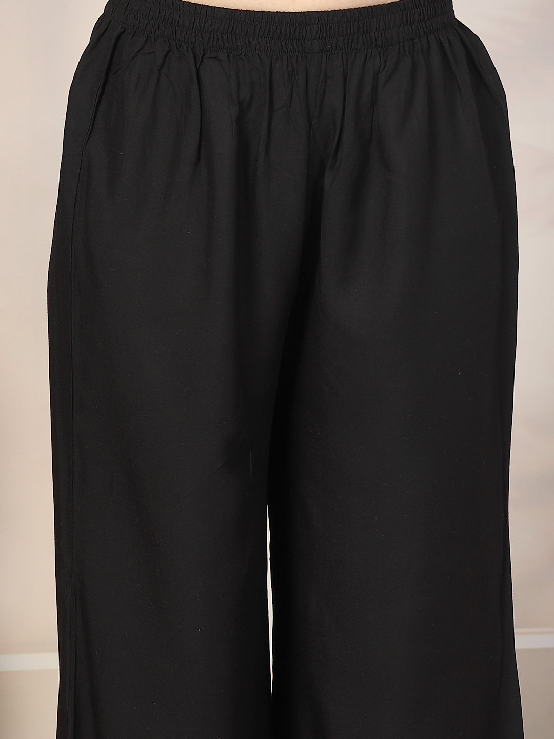 Black rayon ethnic printed kurta pallazo dupatta set. Kurta has pakistani lace on neckline, sleeves and bottom. Solid rayon bottom has fringes lace with fully elasticated belt. Paired with net embroidered dupatta. Kurta Length- 45" Inch, Palazzo Length - 38'' Inch, Dupatta Length - 2.25 Mtr.