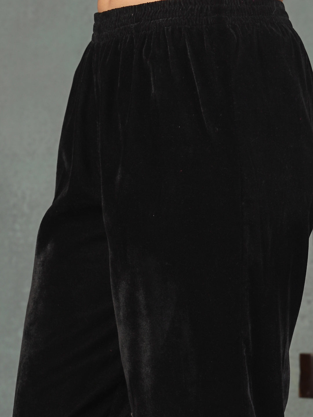 Velvet black solid straight kurta pant dupatta set. Kurta has embroidered border on neckline and sleeves, Solid velvet pant with fully elasticated belt. Paired with embroidered organza dupatta. Kurta Length- 45" Inch, Pant Length- 38'' Inch, Dupatta Length- 2.30 Mtr.