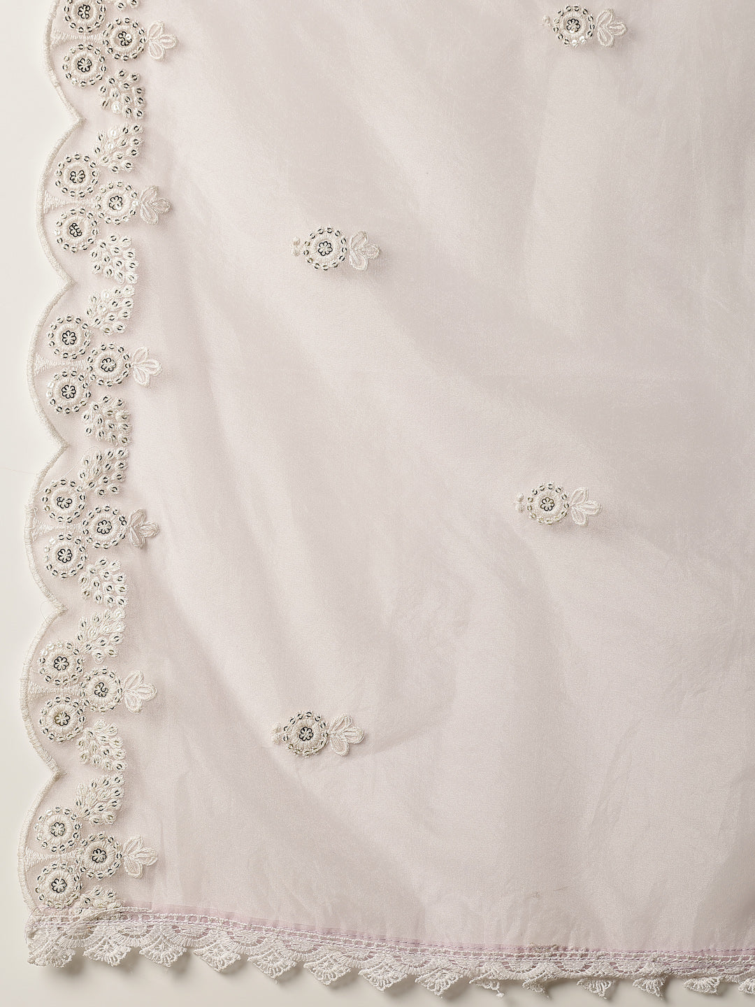 Lavender silk solid embroidered v- neck kurta pant dupatta set. Kurta has fully embroidered neck line and front. Lace detailing on sleeves and kurta bottom. Silk solid regular pant has fully elasticated waistbelt. Paired with laced embroidered scalloped Organza dupatta. Kurta Length-45'' Inch Pant Length - 38''Inch, Dupatta- 2.20 Mtr.