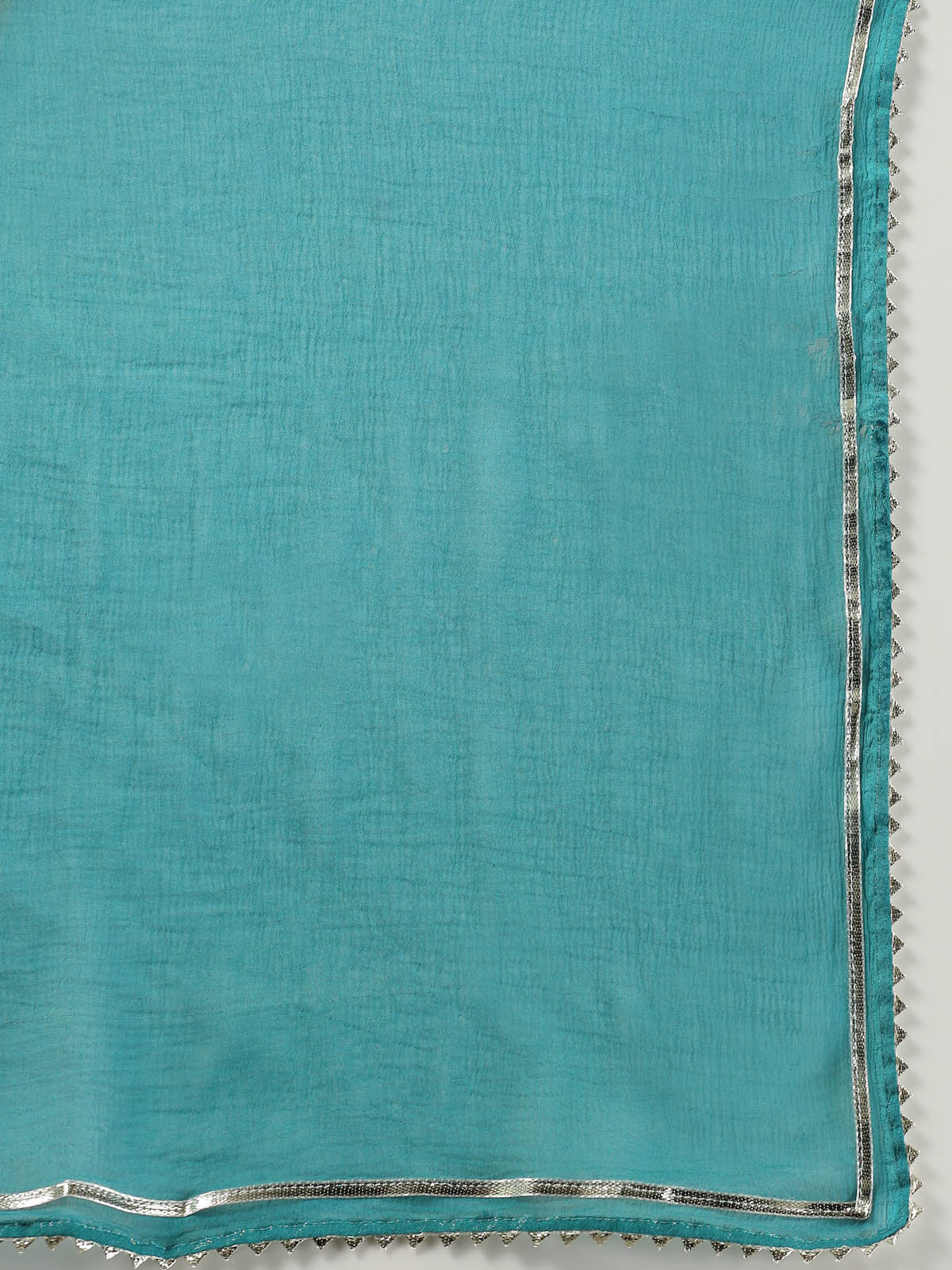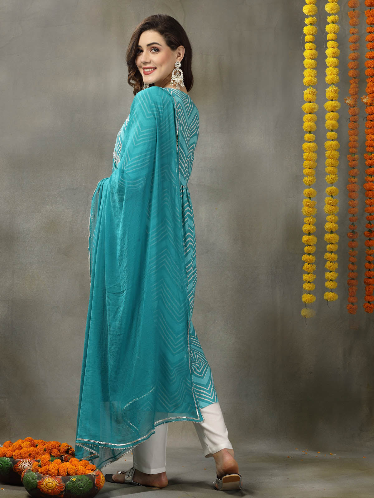 Turq coloured lehriya printed Alia cut kurta set in Cotton fabric. Sequence and mirror work embroidery on yoke. Rayon Soild pant has full elasticated waist. Solid Chiffon dupatta. Kurta Length- 45" Inch, pant length - 38" Inch, Dupatta length - 2.30mtr. Occasion and festive wear outfit.