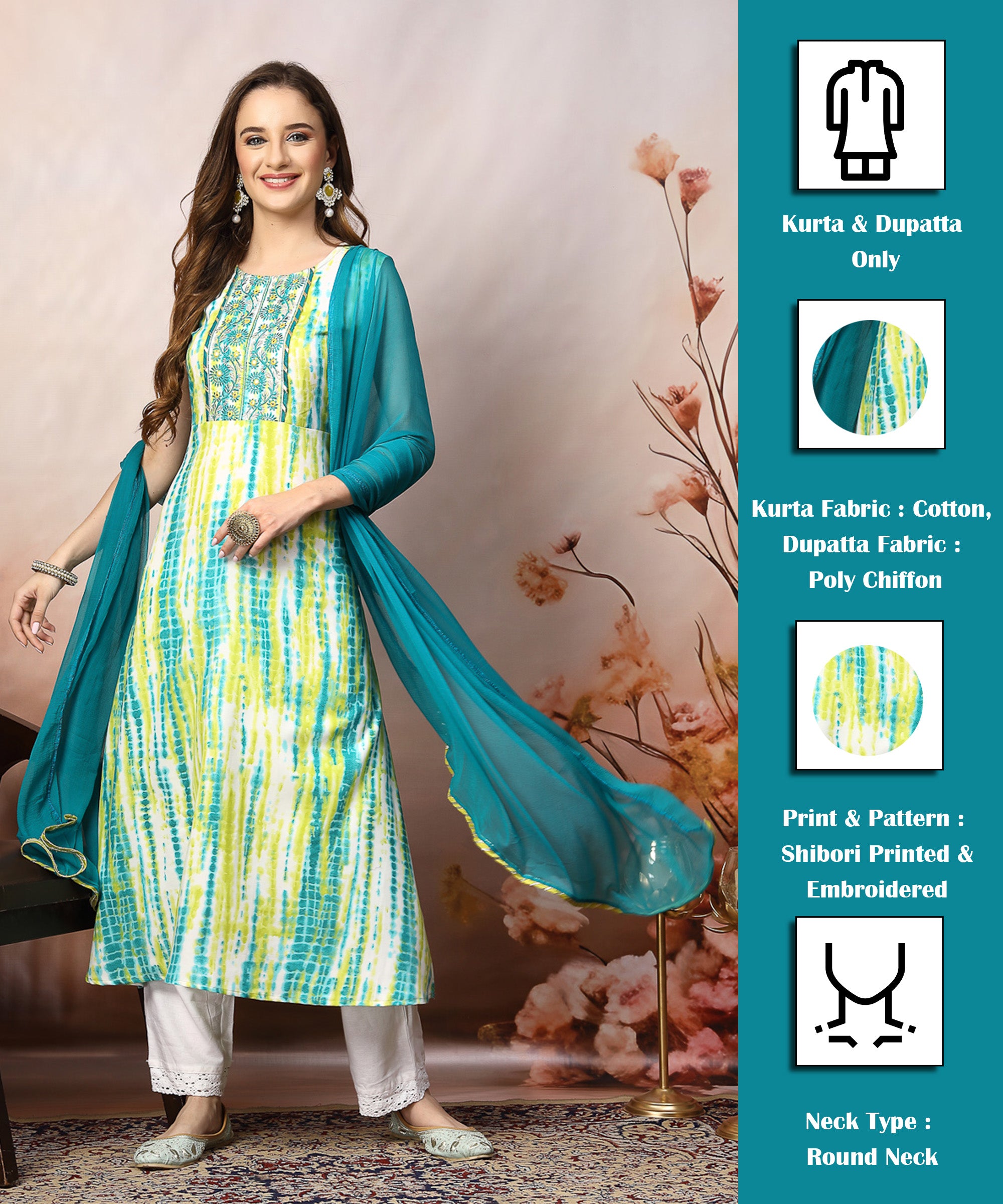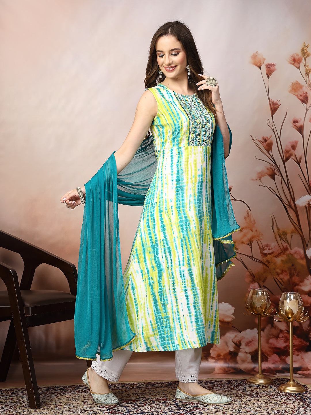 Lime green shibori printed flared kurta dupatta set. Sleeveless kurta has embroidered border on neckline. Paired with dyed chiffon dupatta. Kurta Length - 48'' Dupatta Length - 2.30 mtr.