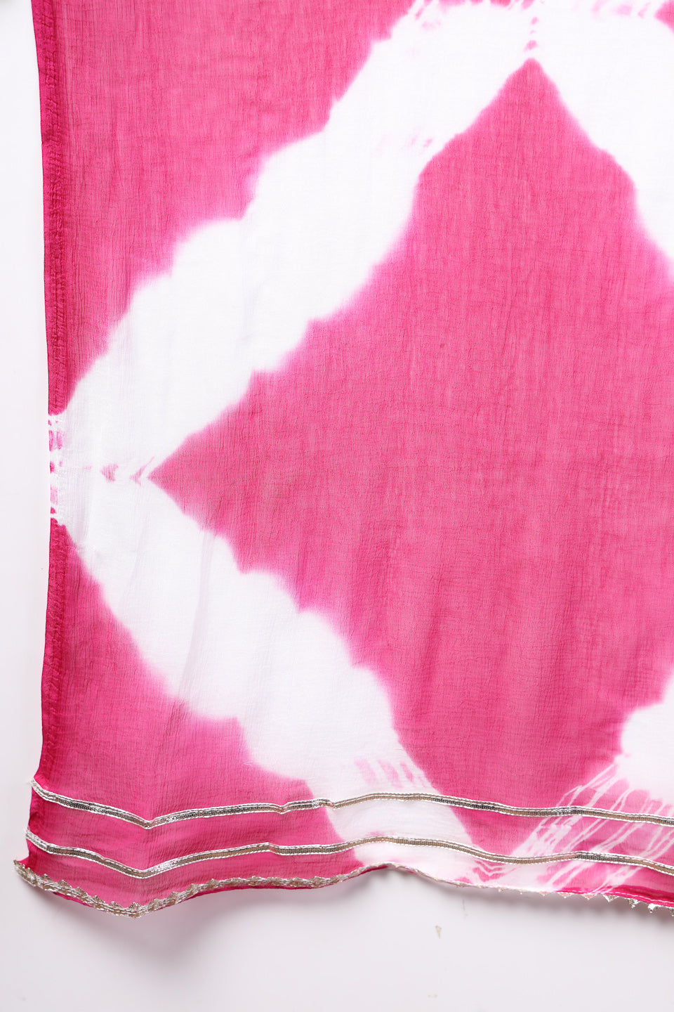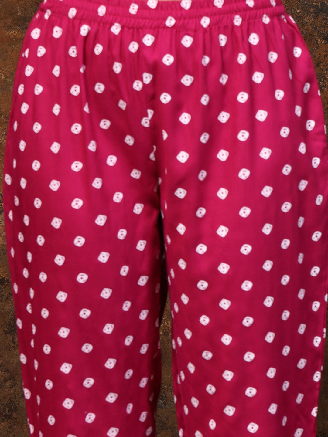 Magenta rayon bandhni printed flared kurta pant dupatta. Kurta has beautiful thread and sequin embroidery yoke and border with lace detailing on it. Printed bottom and chiffon tie and dye dupatta, Kurta Length- 46" Inch, Pant Length - 38'' Inch, Dupatta Length - 2.30 mtr