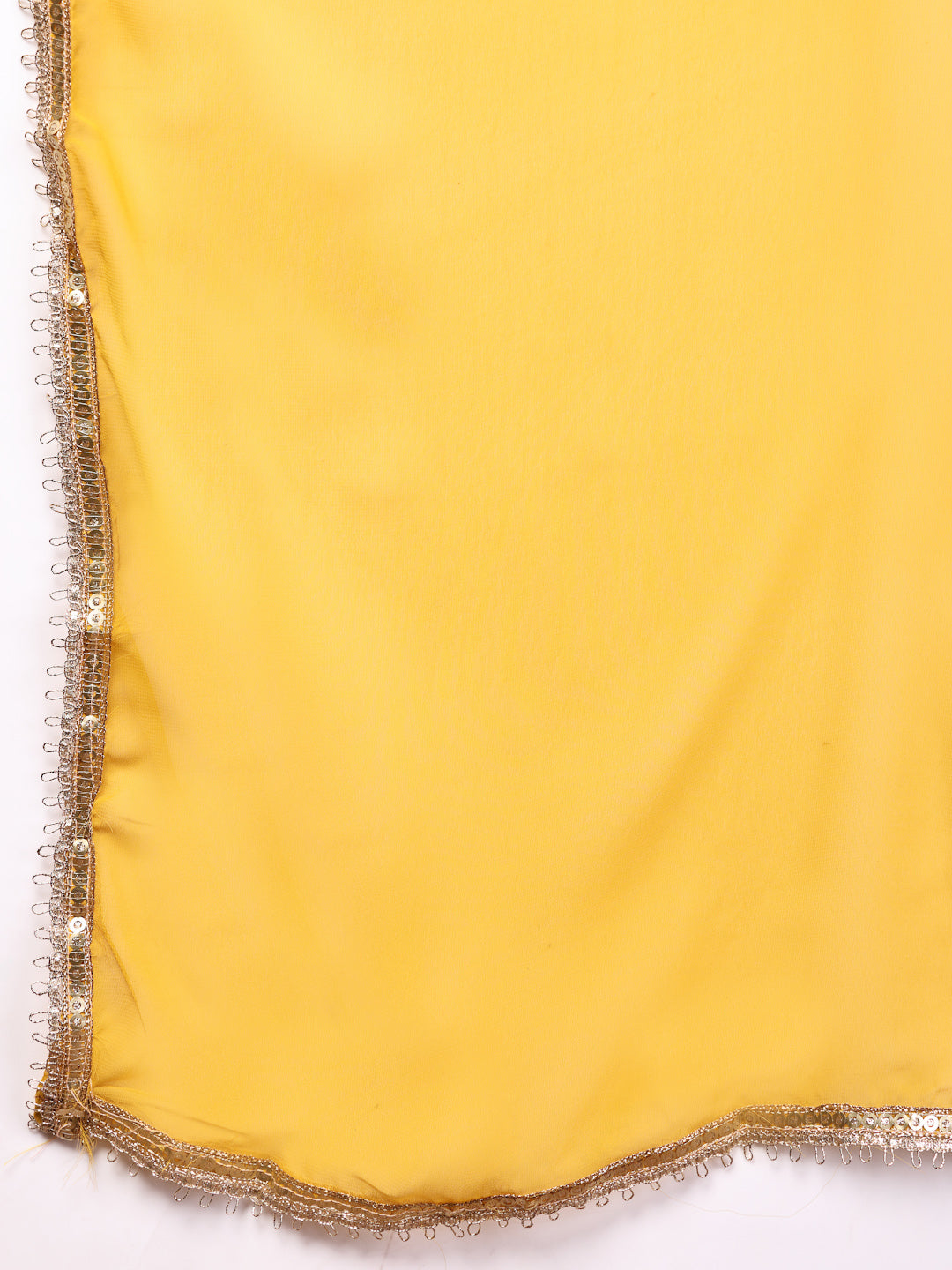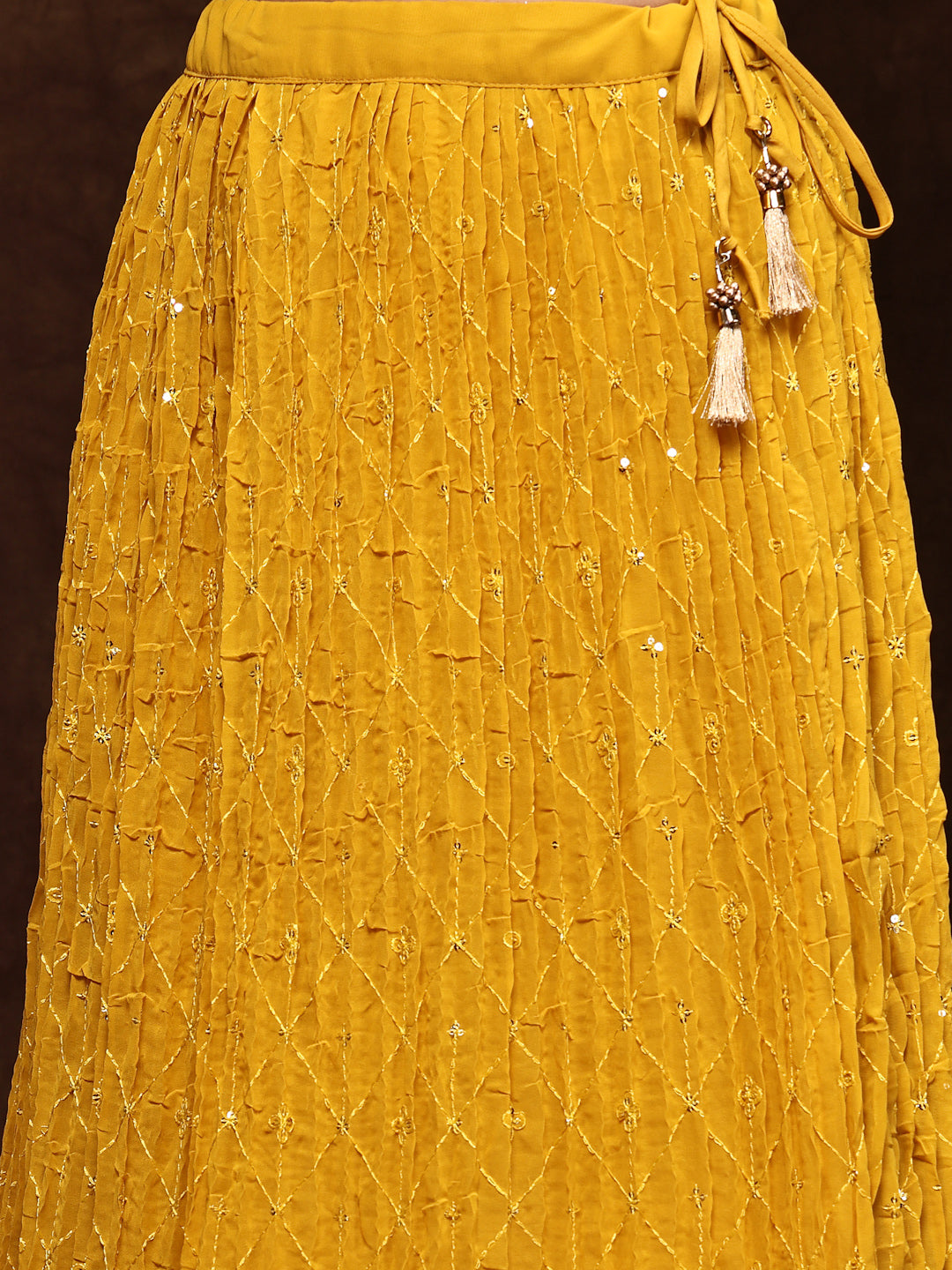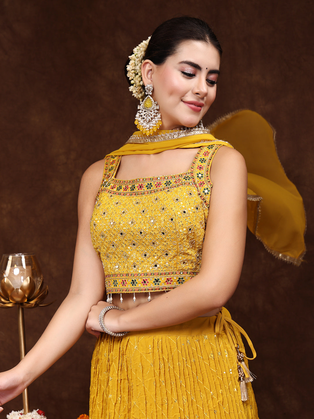 Mustard embroidered georgette lehenga with heavy blouse and dupatta. This lehenga has sleeves fabric inside. Lehenga length-42'' Inch, blouse length-15'' Inch, Dupatta Length:- 2.50 Mtr.