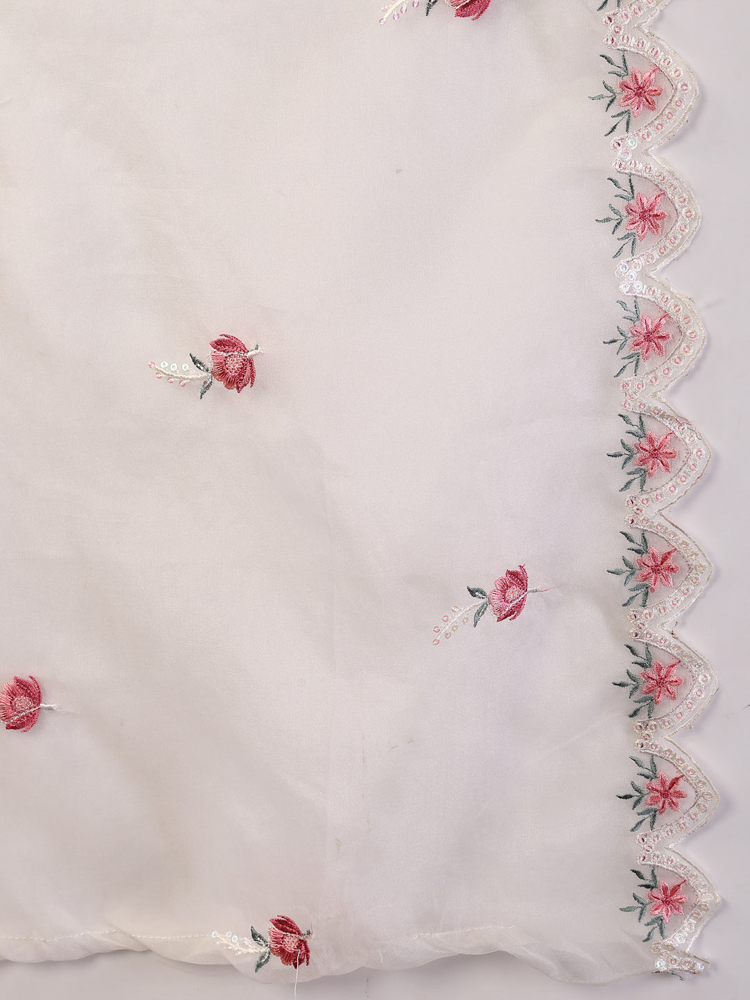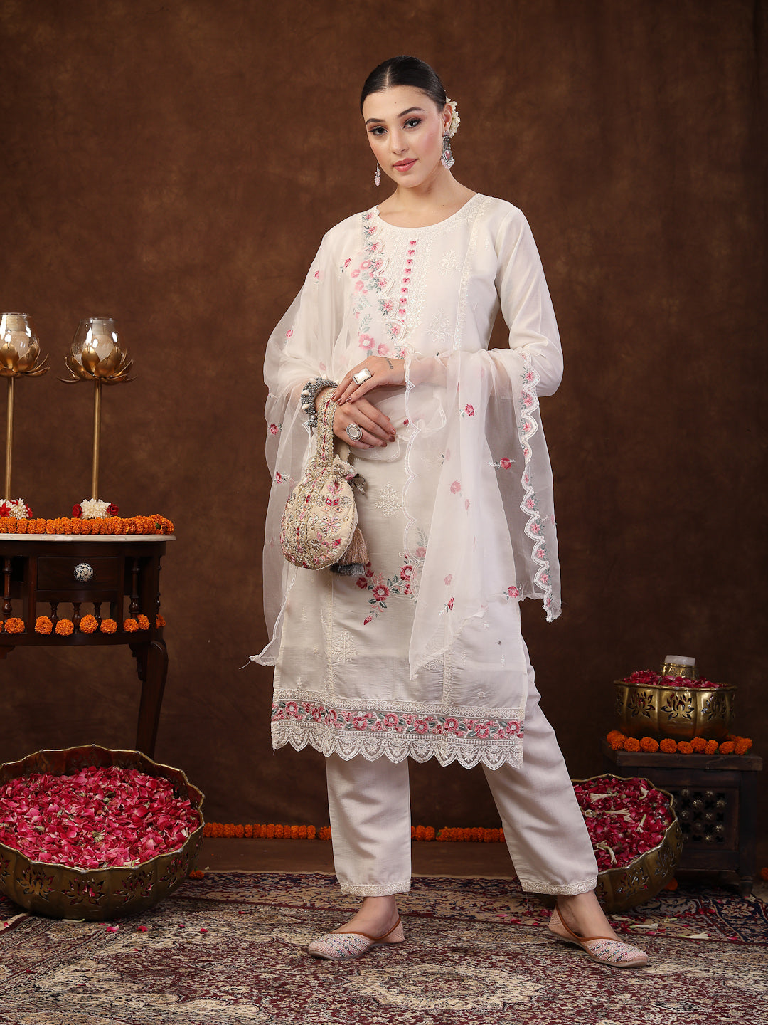 Festive off white colour silk embroidered straight kurta pant dupatta set. Kurta has multi color embroidery all over kurta. Solid silk bottom has fully elasticated belt. Paired with embroidered organza dupatta with scalloped border. Kurta Length - 45'' Inch, Pant Length - 38'' Inch, Dupatta 2.20 Mtr