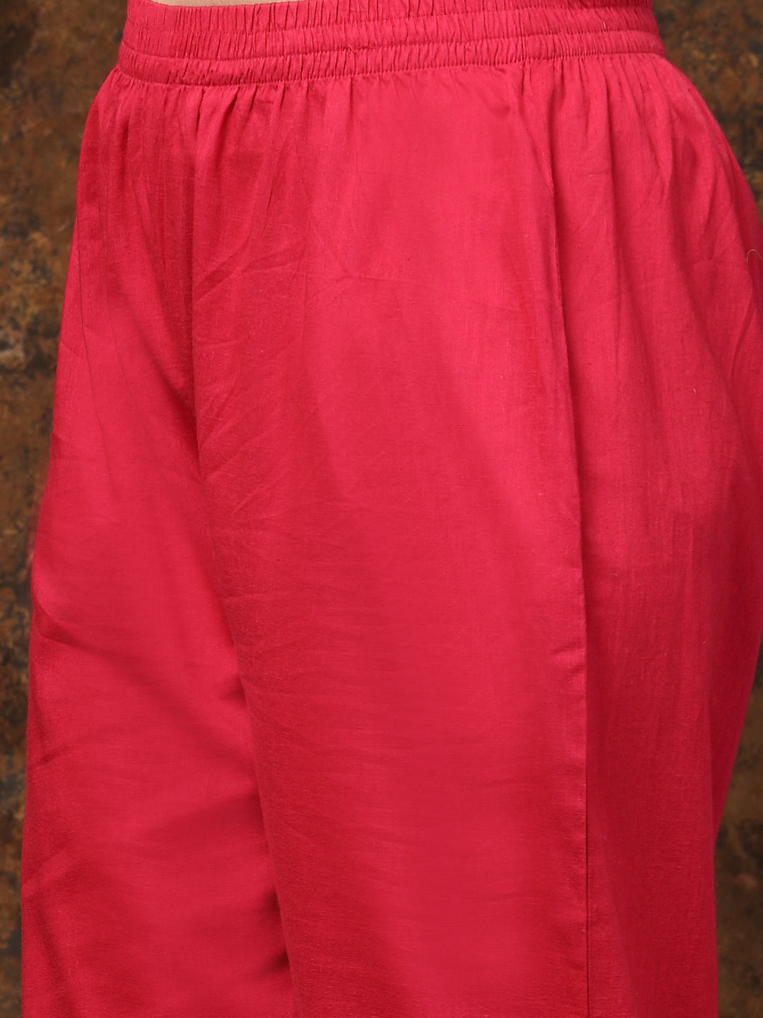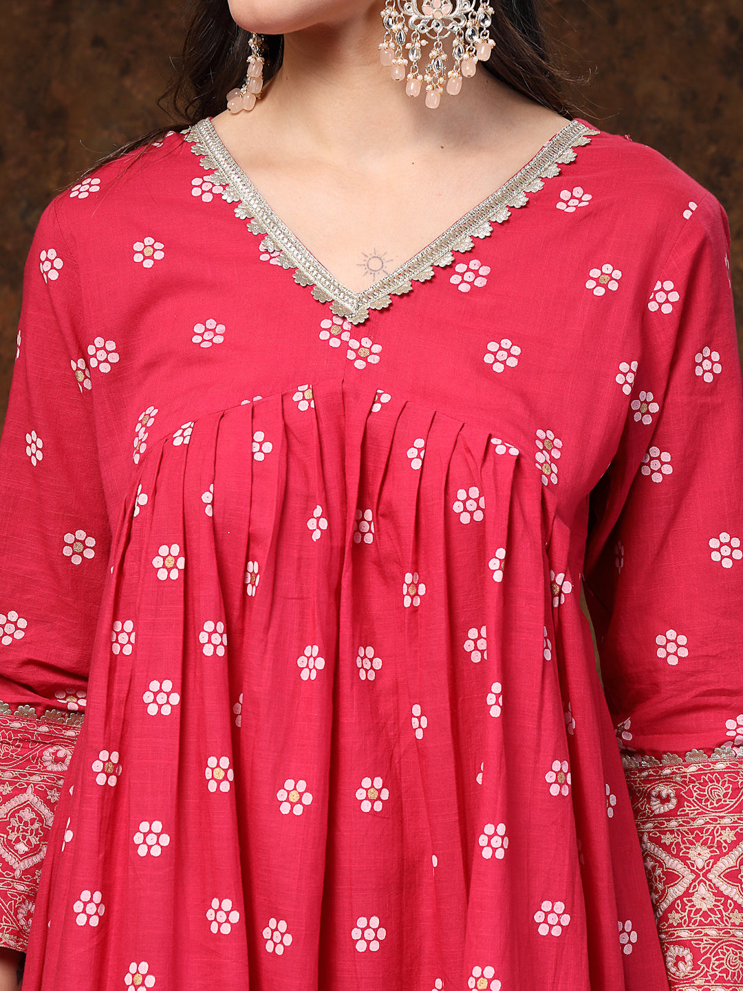 Pink printed anarkali kurta pant dupatta set. Kurta has lace on neckline and sleeves. Printed border in kurta flared. Solid rayon bottom has lace with fully elasticated belt. Paired with heavy organza embroidered dupatta. Kurta Length- 47" Inch, Pant Length - 38'' Inch, Dupatta Length - 2.30 mtr Â