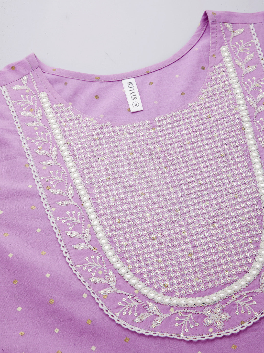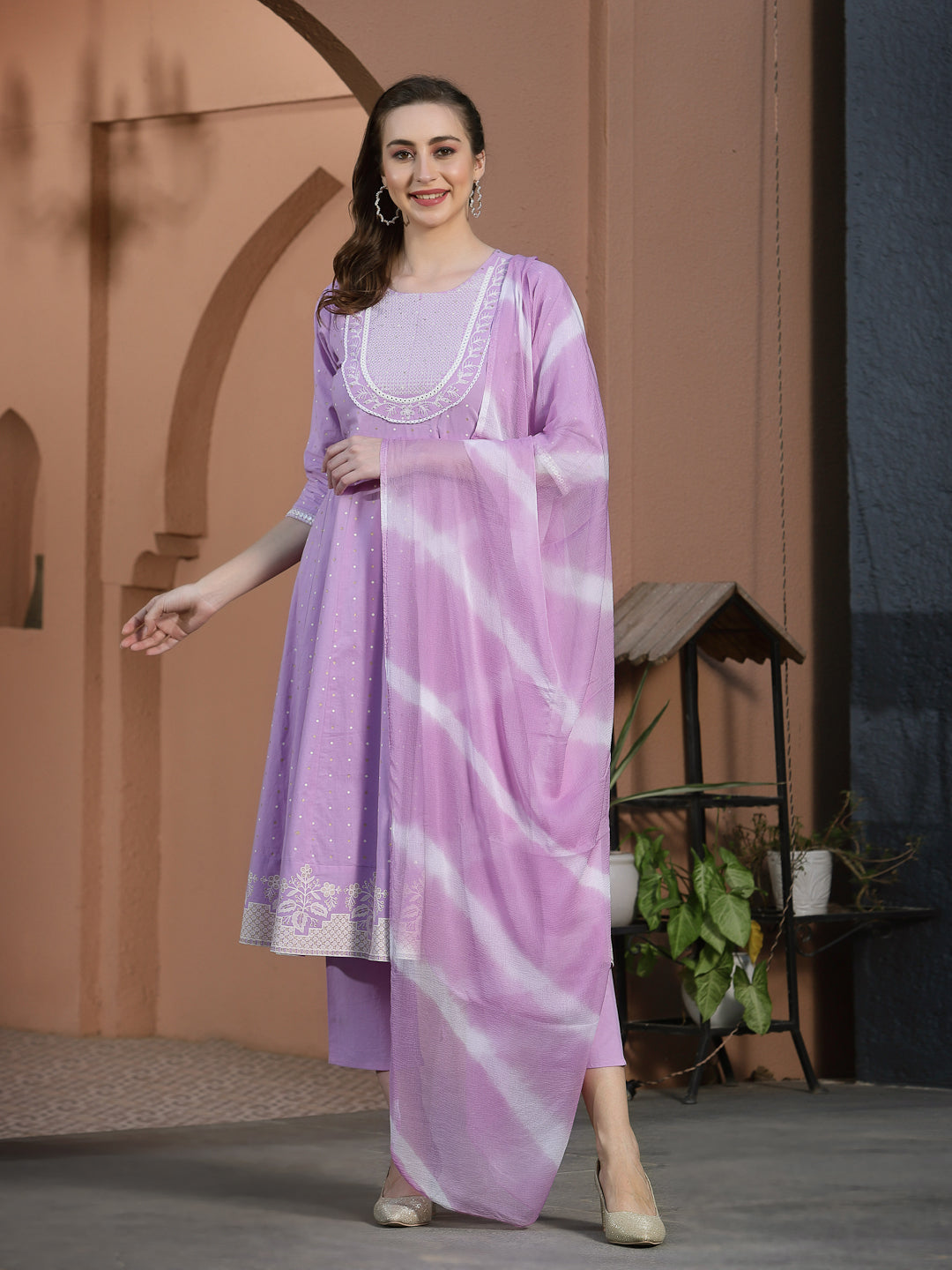 Step out in style and make heads turn with this stunning Printed & Embroidered Cotton Anarkali Kurta Set with dupatta from Stylum. Crafted from premium quality cotton, this set features a lavender anarkali kurta with intricate embroidery and prints that evoke a sense of elegance and grace. The kurta is paired with solid pants that offer comfort and style in equal measure. To complete the look, the set also includes a double-shaded lehariya dupatta with delicate lace taping on both sides. The dupatta adds a touch of femininity and sophistication to the ensemble, making it perfect for any occasion. Shop now!