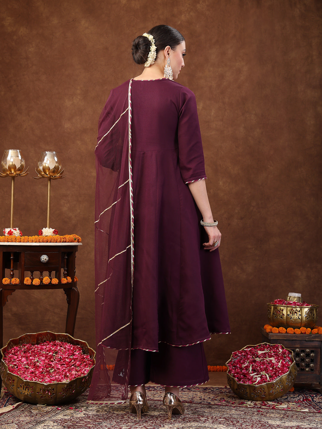 Festive wine solid anarkali kurta pant dupatta set in Italian crush fabric. Kurta has colourfull lace detailed angrakha yoke. Dori, triangle latkans and laces on flair and pant. Soild Pant is fully elasticated. Paired with net printed dupatta. Kurta Length- 47" Inch, Pant Length - 38'' Inch, Dupatta Length - 2.30 Mtr.