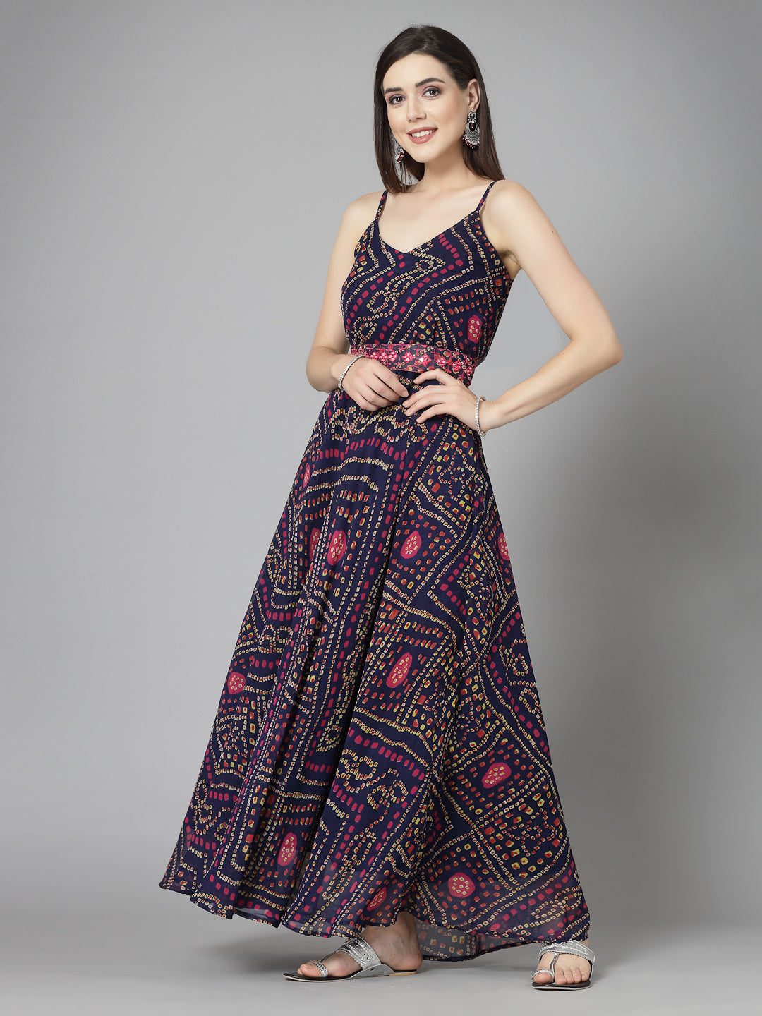 Enhance your ethnic style with our very beautiful Bandhej Printed Georgette Flared Long kurta. This kurta is the most versatile and fashionable addition to your wardrobe. This cotton flared dress features a gorgeous bandhej print that adds a touch of cultural richness to the kurta. Crafted in premium georgette fabric, this kurta gives you a comfortable feel all day. The waistline of the kurta comes adorned with mirrorwork embroidered belt that helps sit this kurta comfortably according to the body shape. Pair this kurta with matching oxidised jewellery and footwear to enjoy a boho-indian look.