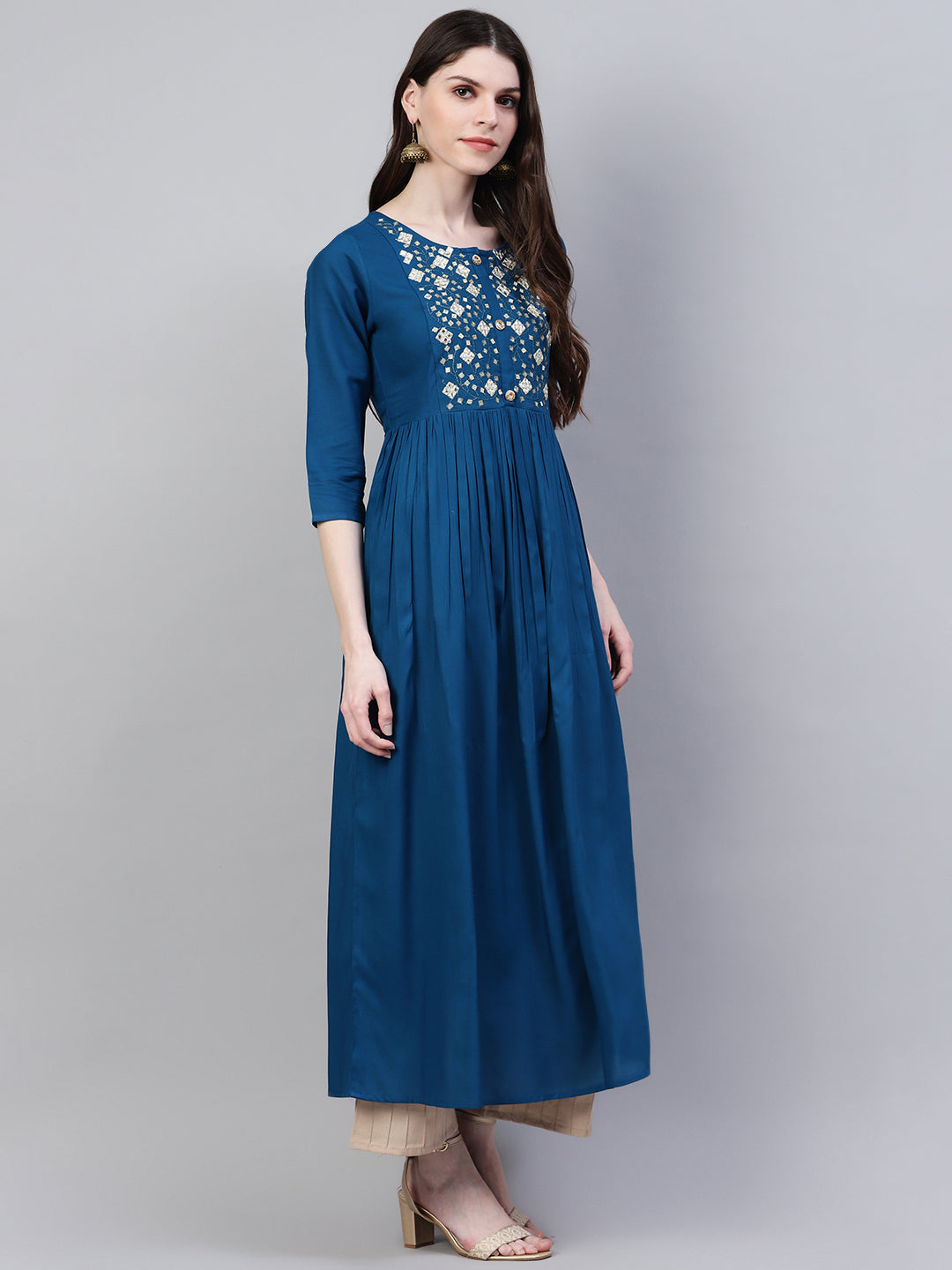 Introducing the Stylum Women's Embroidered Rayon Flared Kurta, a stunning ethnic dress that will capture hearts this season. In a bright teal blue shade, this kurta exudes a charm that is both eye-catching and soothing. Made from high-quality rayon fabric, it offers unparalleled comfort and breathability, perfect for all-day wear. The flared kurta adds elegance and grace, allowing easy and confident movement. One standout feature is the exquisite zari embroidered yoke. The intricate detailing adds a luxurious and sophisticated element to the design, showcasing the brand's commitment to craftsmanship and attention to detail. Upgrade your wardrobe with the Stylum Women's Embroidered Rayon Flared Kurta and experience the perfect blend of comfort, style, and elegance.