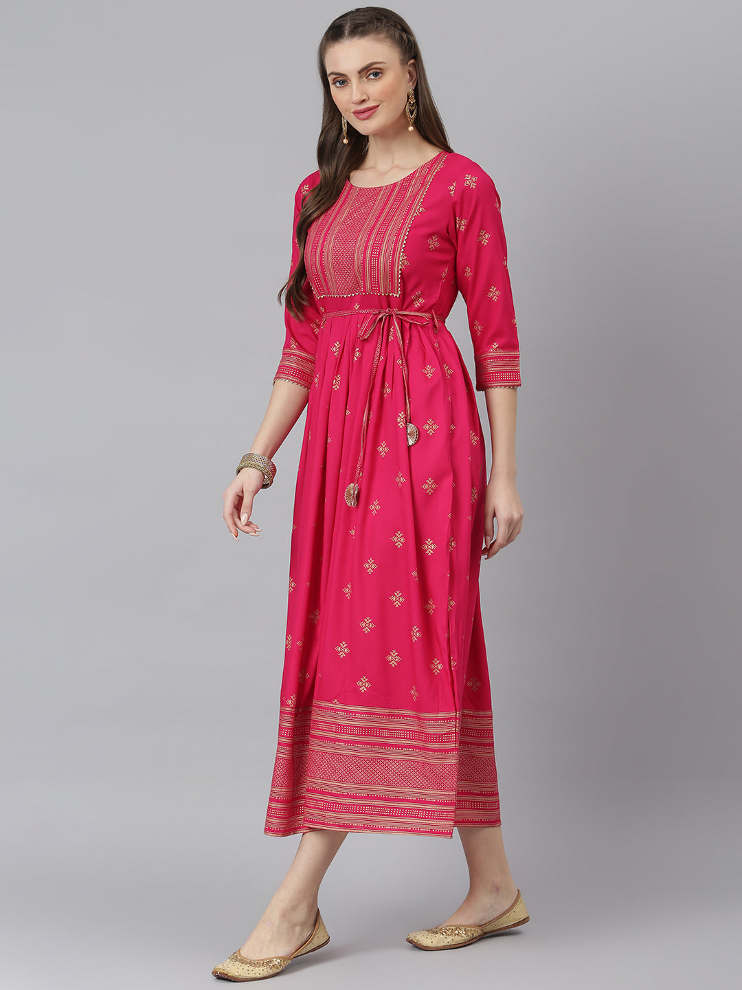 Wearing the exquisite Stylum Women's Gold Printed Rayon Flared Kurta is an absolute delight. Embrace the essence of ethnicity with this charming long-flared kurta adorned with a lovely pink border. The yoke placement has delicate laces and embellished doris with gota flowers, adding a touch of festivity to this attire. The rayon fabric is used to make this high-quality fabric, and this pleated kurta dress exudes elegance and comfort. Complete your look by pairing it with stunning heels and jhumkas, and you will surely become the centre of attention in town. Get your hands on this beautiful kurta without compromising on your style.