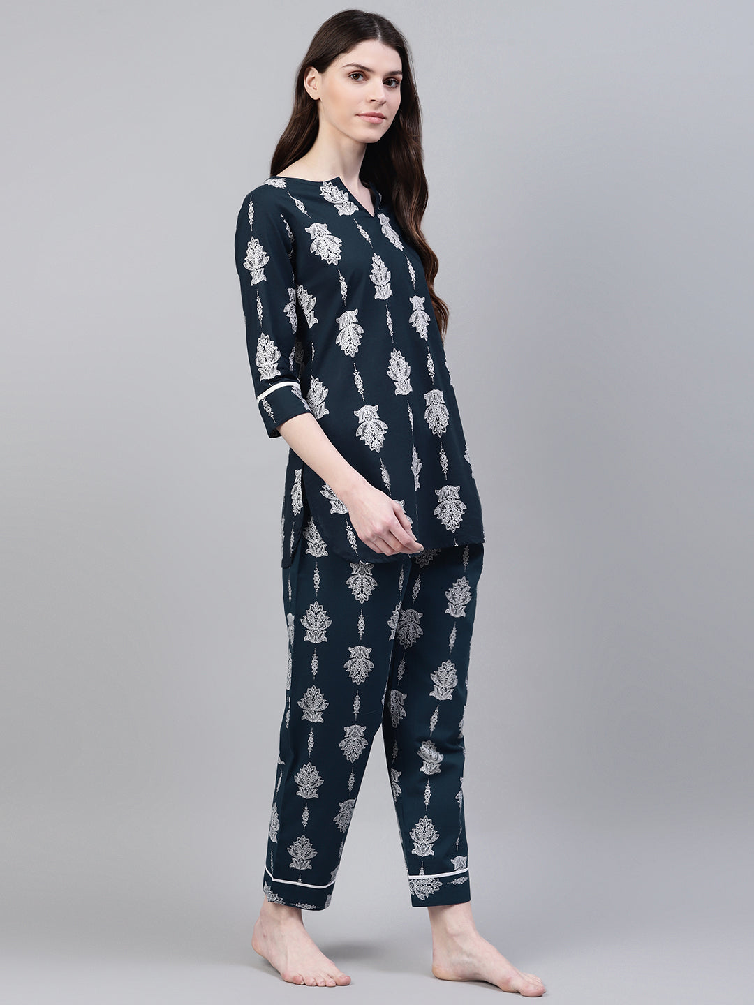 Discover Stylumââ¬â¢s floral print cotton plus size night wear. It is the ultimate solution for your comfortable and stylish sleepwear needs. Whether you are working from home or taking a well deserved rest, the night suit plus size has got you covered. Crafted from high-quality cotton material, this night suit is perfect for plus-size ladies who want to feel comfortable and look great at the same time.The indigo print adds a touch of elegance to this night suit, making it perfect for women who value style and comfort. It is one of the perfect piece from our plus size night suit for ladies collection.