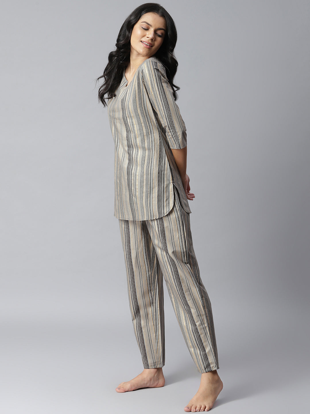 Lounge in style with our very soothing and comfortable range of cotton night suit sets. This amazing cotton night suit set features an amazing grey-striped print that speaks for its visual elegance. With a round neckline and a full-sleeved ethnic top and pyjama, this night suit set is perfect for your work-from-home or rest-from-home days. Meticulously crafted in comfortable fabric, this night suit will make your nights blissfully comfortable and days delightfully cosy. Available in all sizes, shop for this gorgeous cotton night suit set today from Stylum.