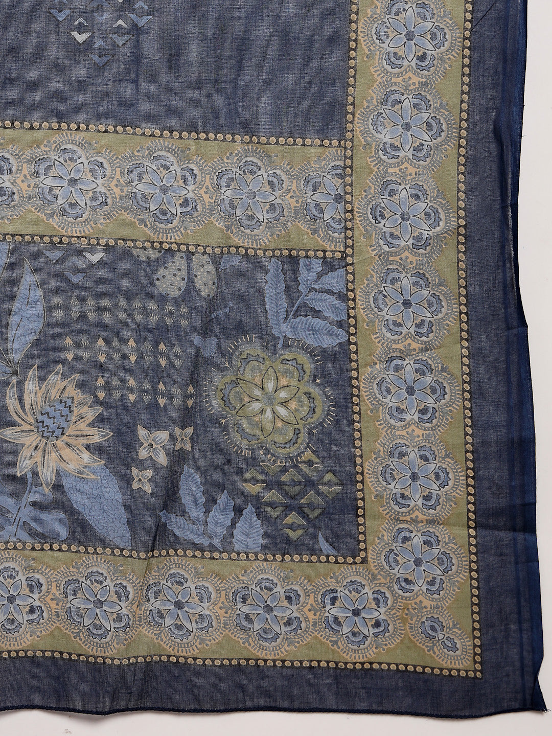 Blue floral printed cotton straight kurta pant dupatta set. Kurta has round neck with tassels & beads work on it and regular sleeves with beads work on it. Blue printed cotton pant has half elasticated waistband with one side pocket. Paired with printed mulmul dupatta. Kurta Length- 44'' Inch, Pant Length- 38'' Inch. Dupatta Length- 2.30 Mtr.