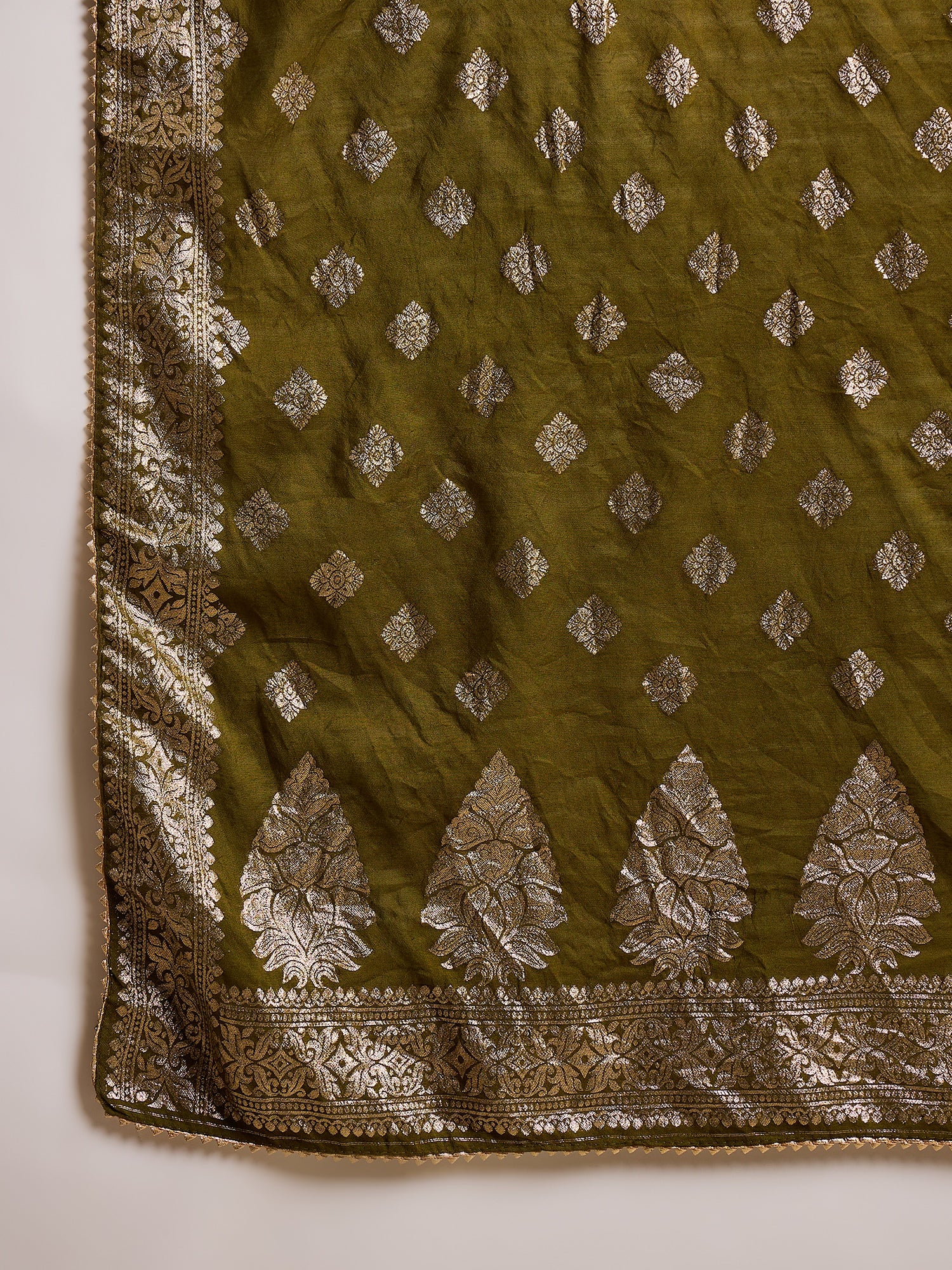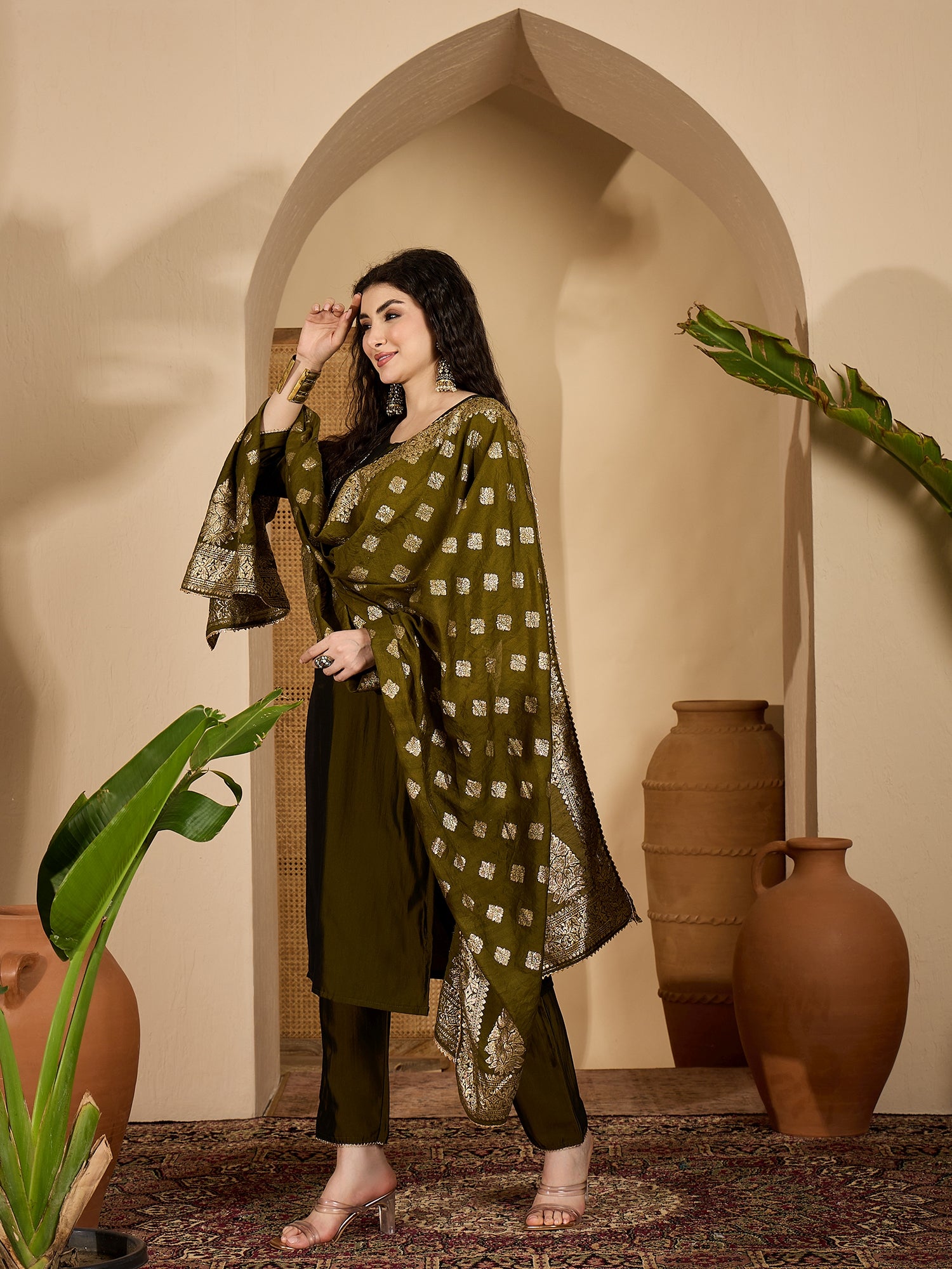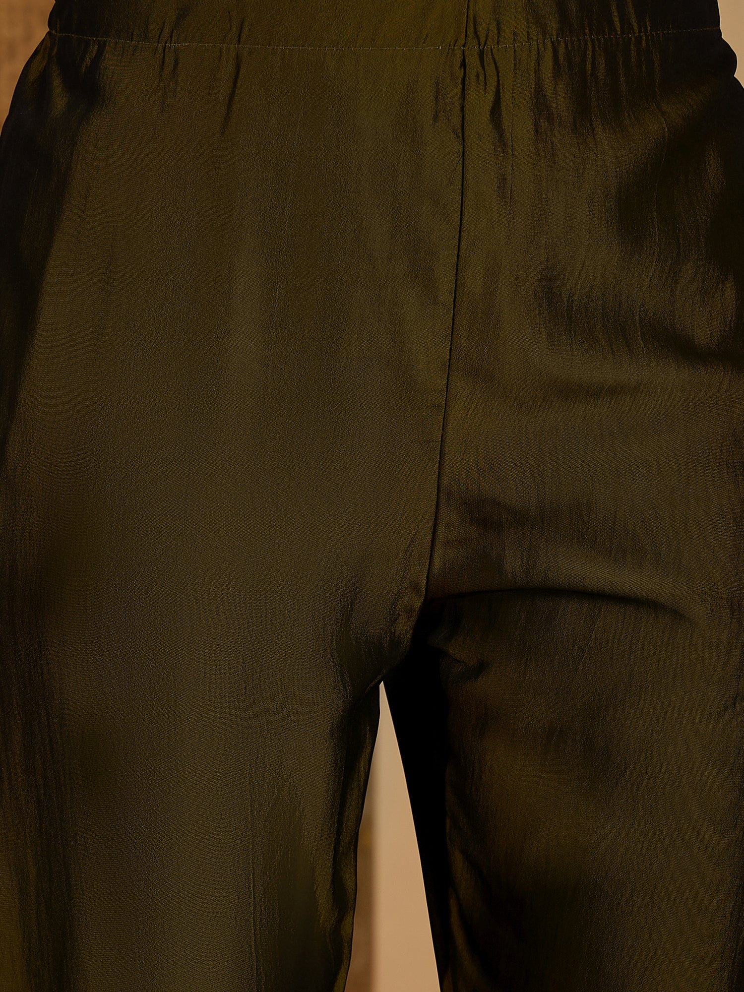Green solid roman silk straight kurta pant dupatta set. Kurta has round neck with cutdana work with potli button on front, regular sleeves. Green solid pant has half-elasticated waistband. Paired with green jacquard dupatta. Kurta Length - 44'' inch, Palazzo Length - 38'' inch, Dupatta Length - 2.30 mtr.