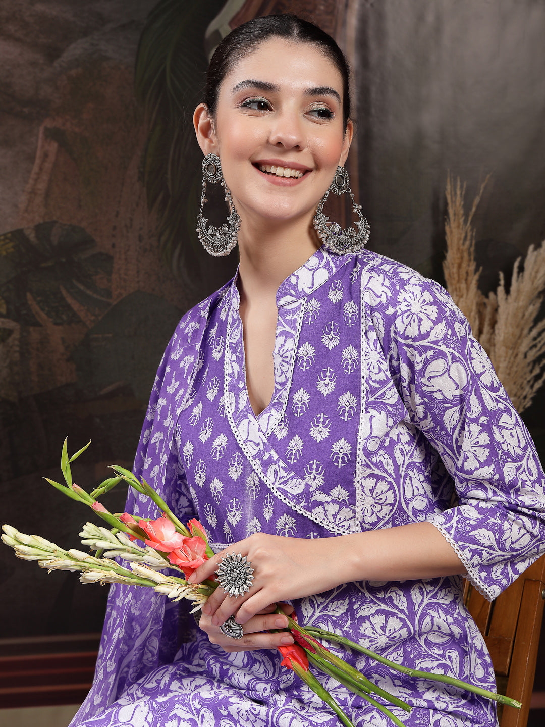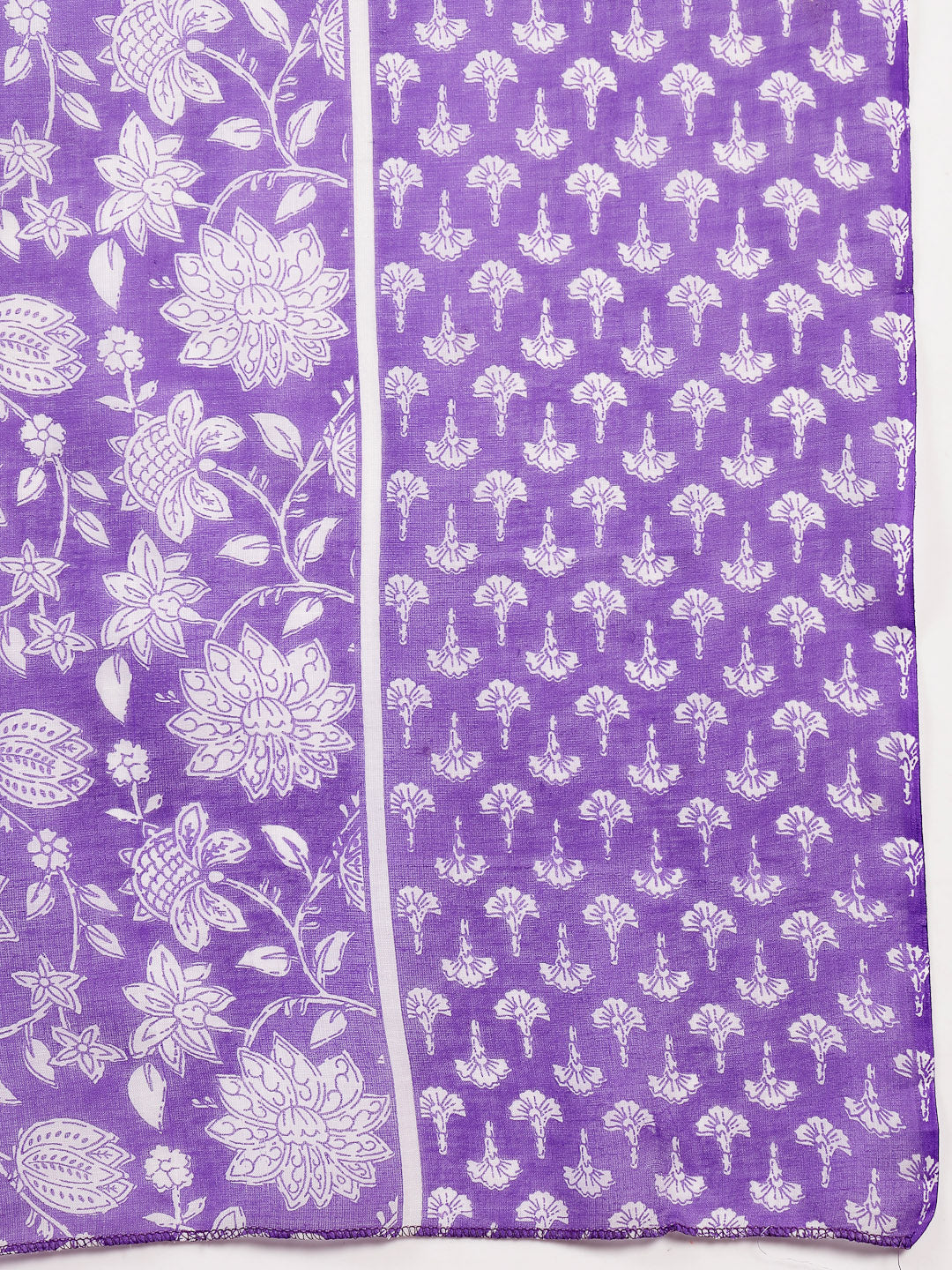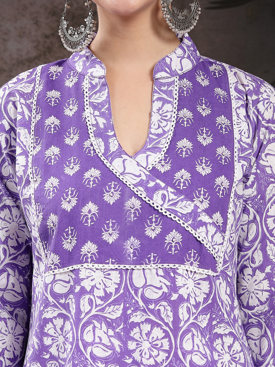 Lavender floral printed cotton straight kurta pant dupatta set. Kurta has v-neck with lace yoke on it and regular sleeves with lace on it. Lavender printed cotton pant has fully elasticated waistband. Paired with printed cotton dupatta. Kurta Length- 45'' Inch, Pant Length- 38'' Inch, Dupatta Length- 2.30 Mtr.
