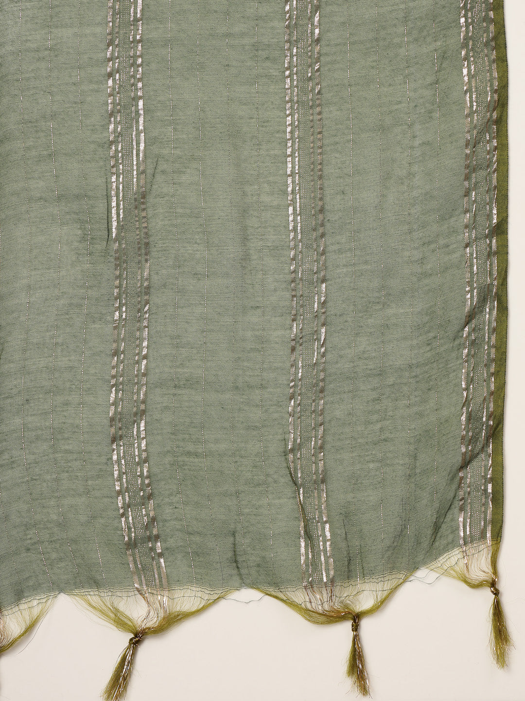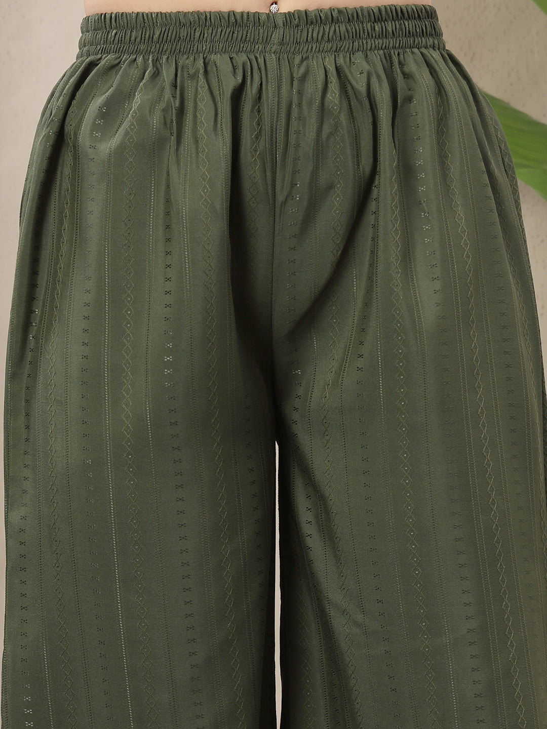 Olive woven design and embroidered cotton blend straight kurta palazzo dupatta set. Kurta has square neck with embroidery & coins on it and sleeveless. Olive self design cotton blend palazzo has fully elasticated waistband. Paired with solid rayon dupatta. Kurta Length- 45'' Inch, Palazzo Length- 38'' Inch, Dupatta Length- 2.30 Mtr.