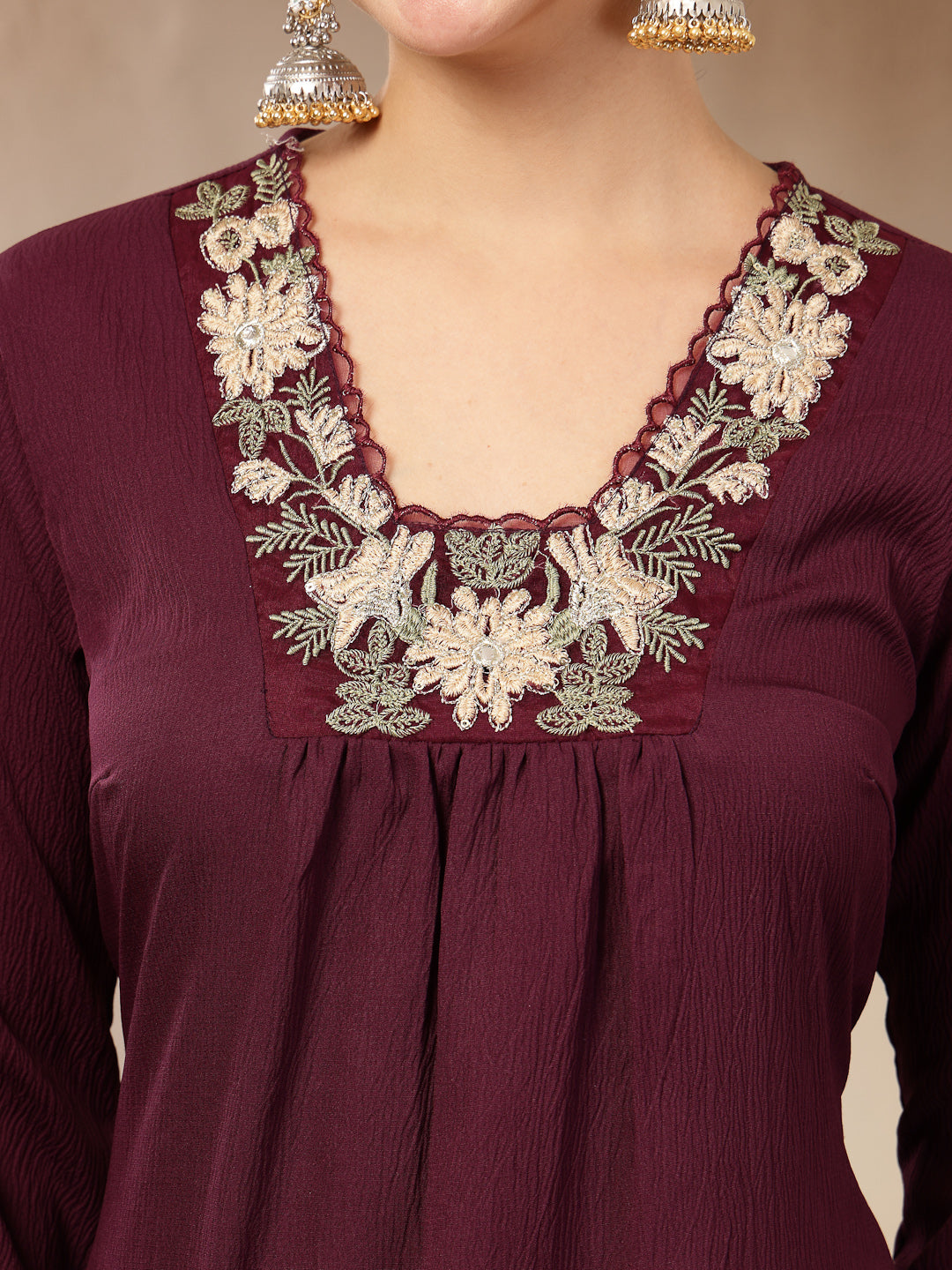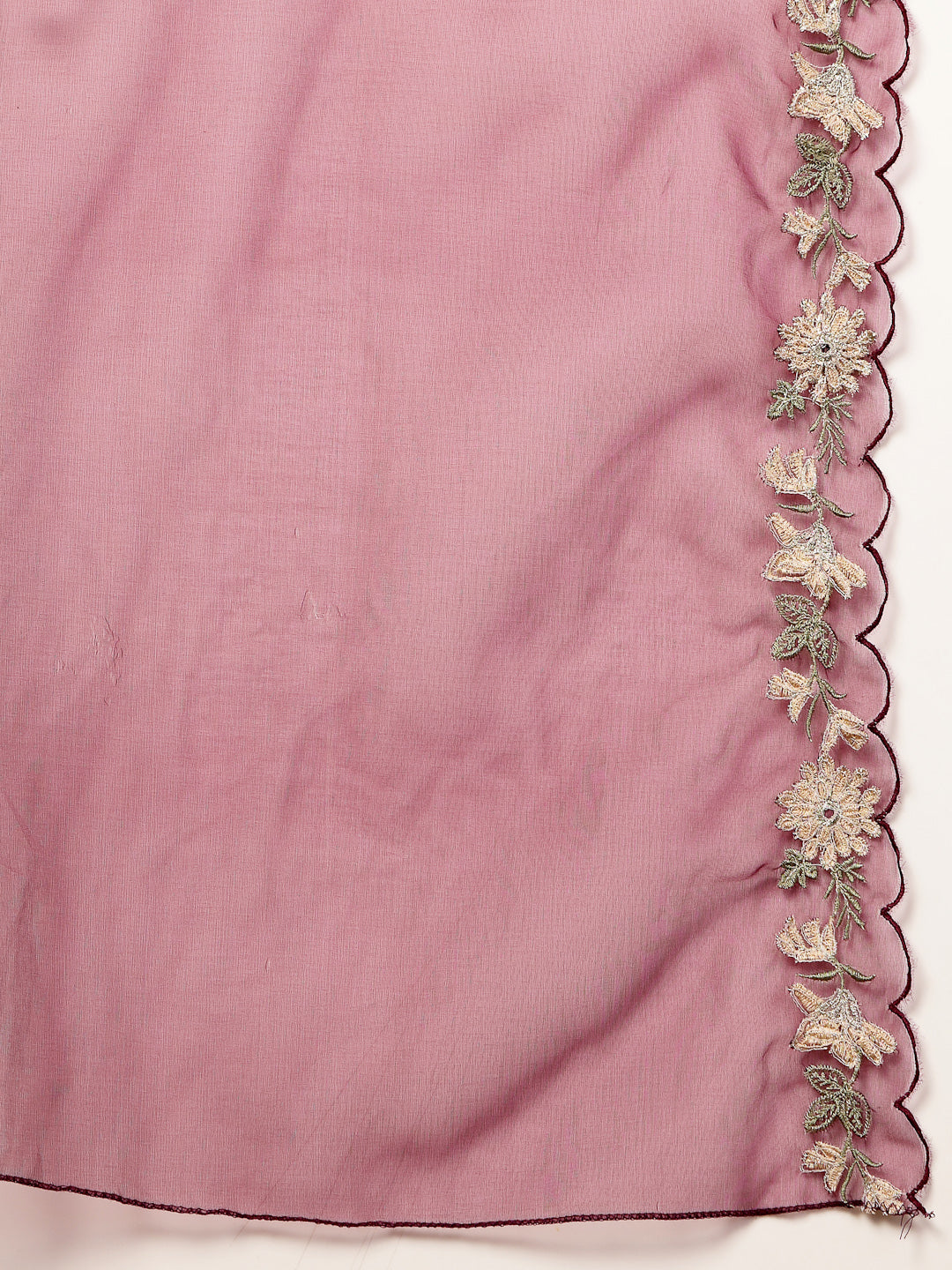 Violet solid and embroidered crepe a-line kurta pant dupatta set. Kurta has v-neck with embroidery & lace on yoke and sleeveless. Violet solid crepe pant has fully elasticated waistband. Paired with solid organza dupatta with embroidery lace on it. Kurta Length- 45'' Inch, Pant Length- 38'' Inch, Dupatta Length- 2.30 Mtr.