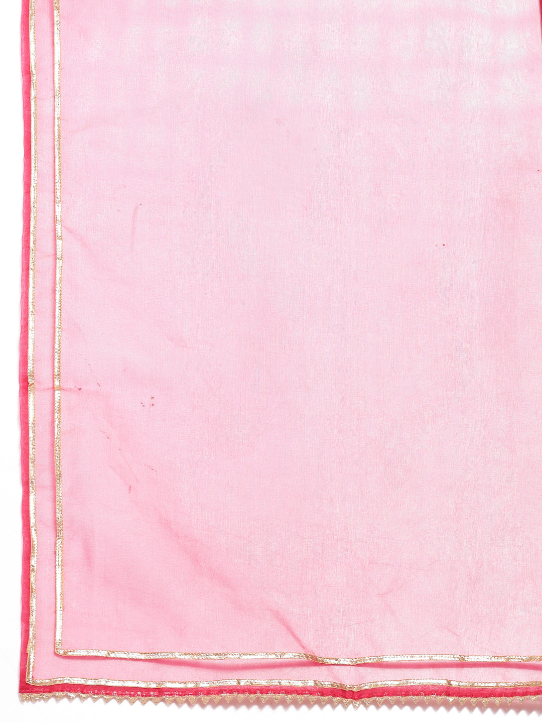 Dark pink printed and embroidered straight kurta pant dupatta set. Kurta has embroidered yoke, with 3/4 sleeve. It has solid pant and solid chiffon dupatta, Kurta Length- 45" Inch, Pant Length - 38'' Inch, Dupatta Length - 2.30 mtr.