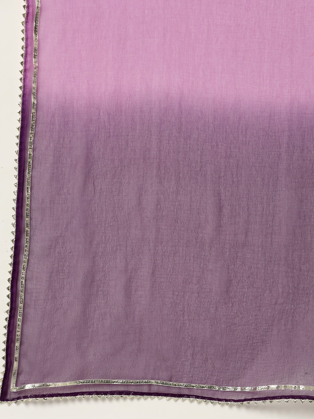 Purple viscose rayon khari print straight kurta with printed sharara and dupatta set. Angrakha has beautiful gota & bijiya detailing and gota  with 3/4 sleeve, kurta bottom and sleeve and pant bottom has gota & lace detailing on it with fully elasticated solid rayon pant and chiffon printed dupatta, Kurta Length- 48" Inch, Pant Length - 38'' Inch, Dupatta Length - 2.30 mtr